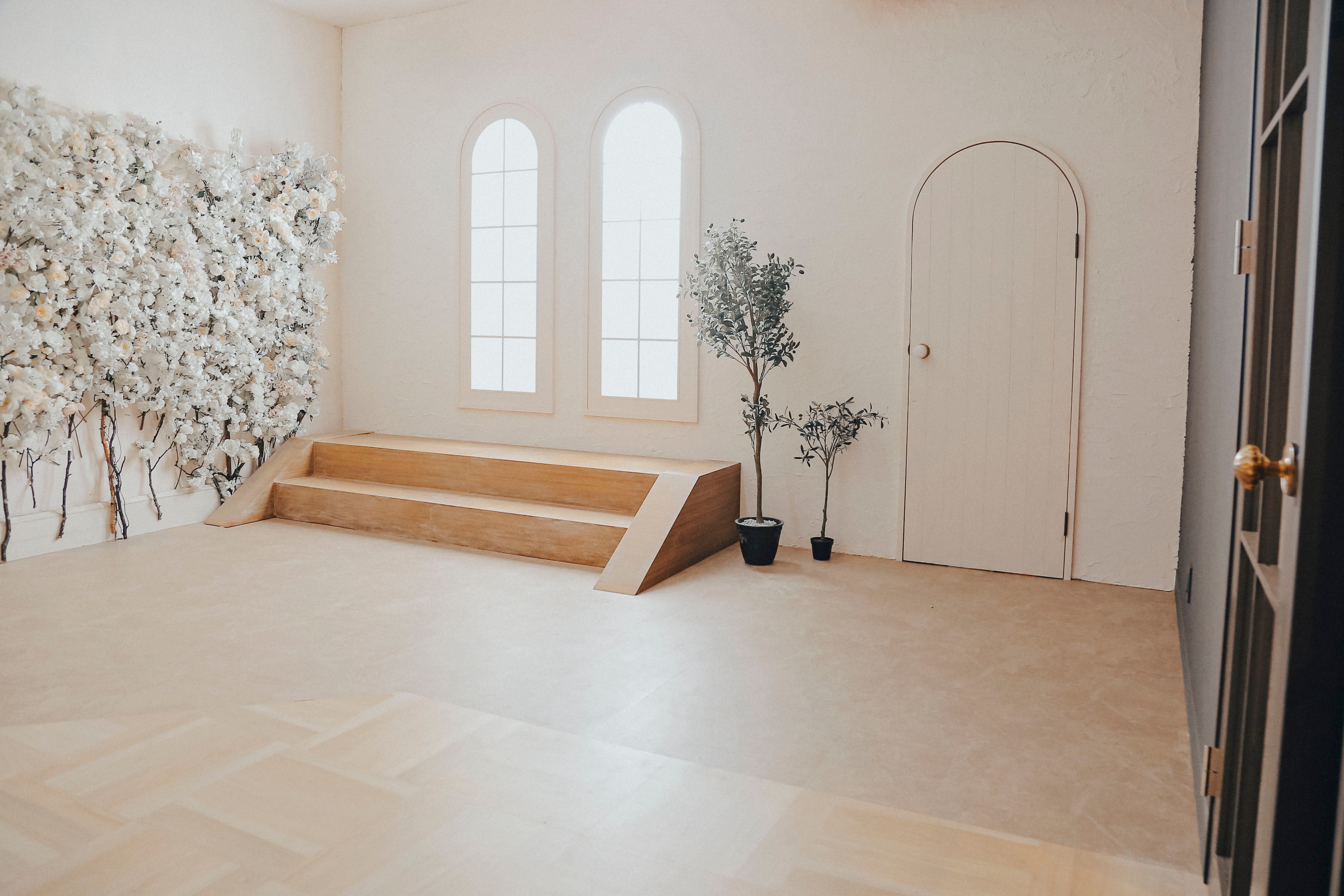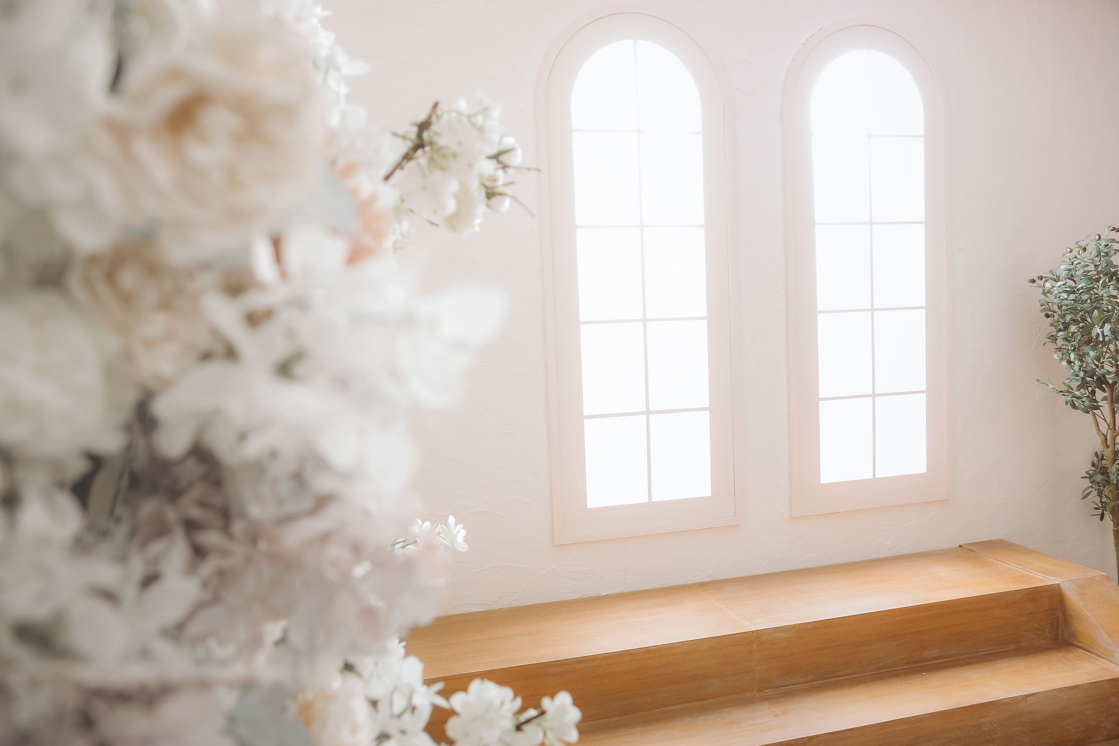 白いお花で埋め尽くされた壁と大きな窓が印象的な背景。