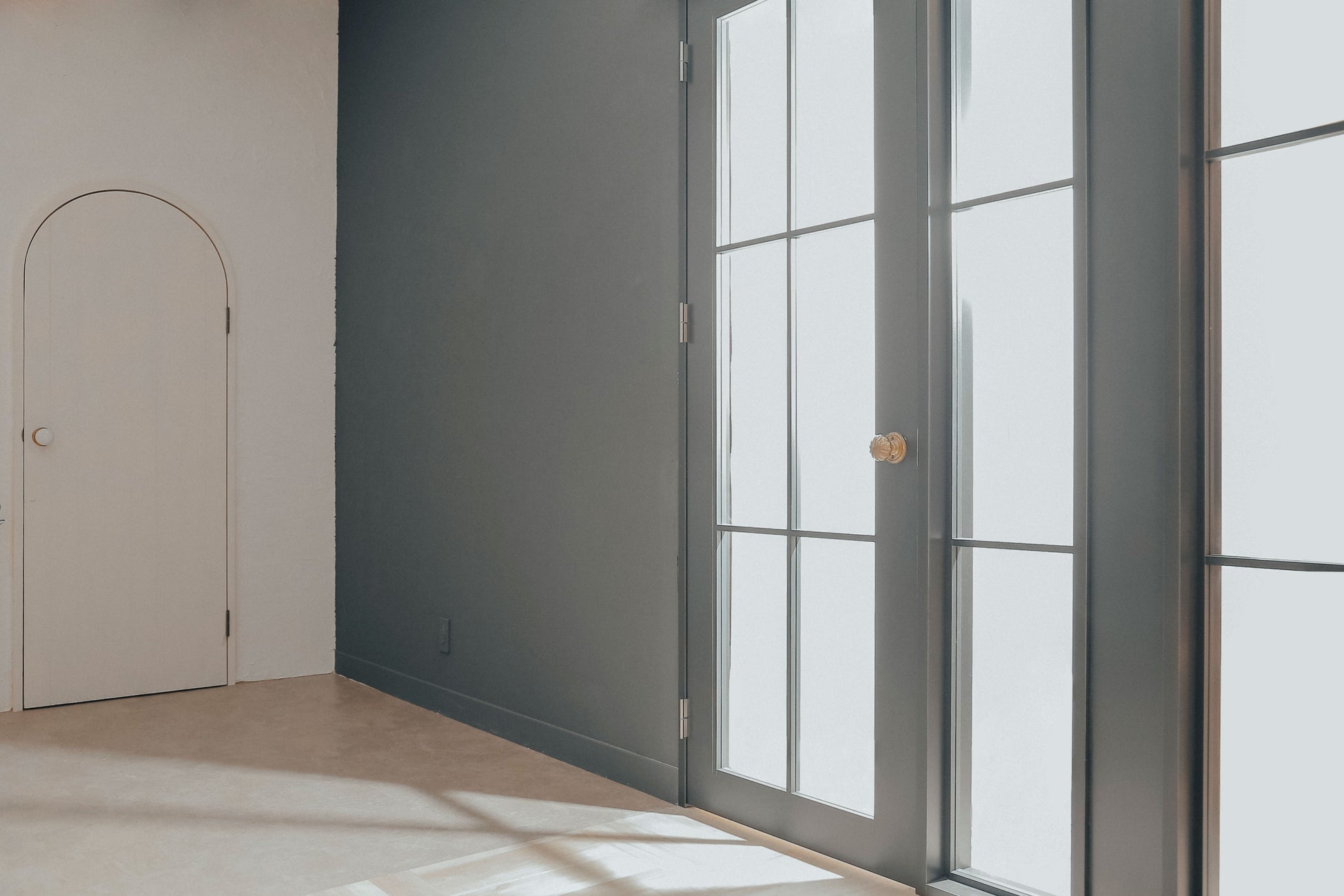 スタジオの入口でもある黒い扉は、モードで都会的な雰囲気での撮影が可能に。