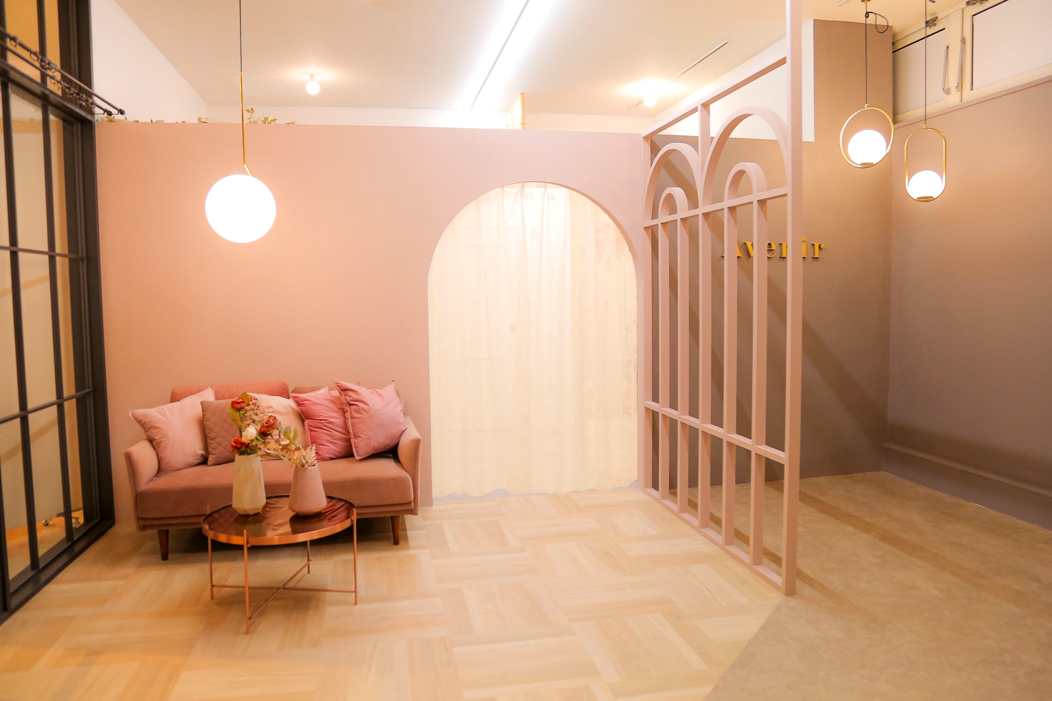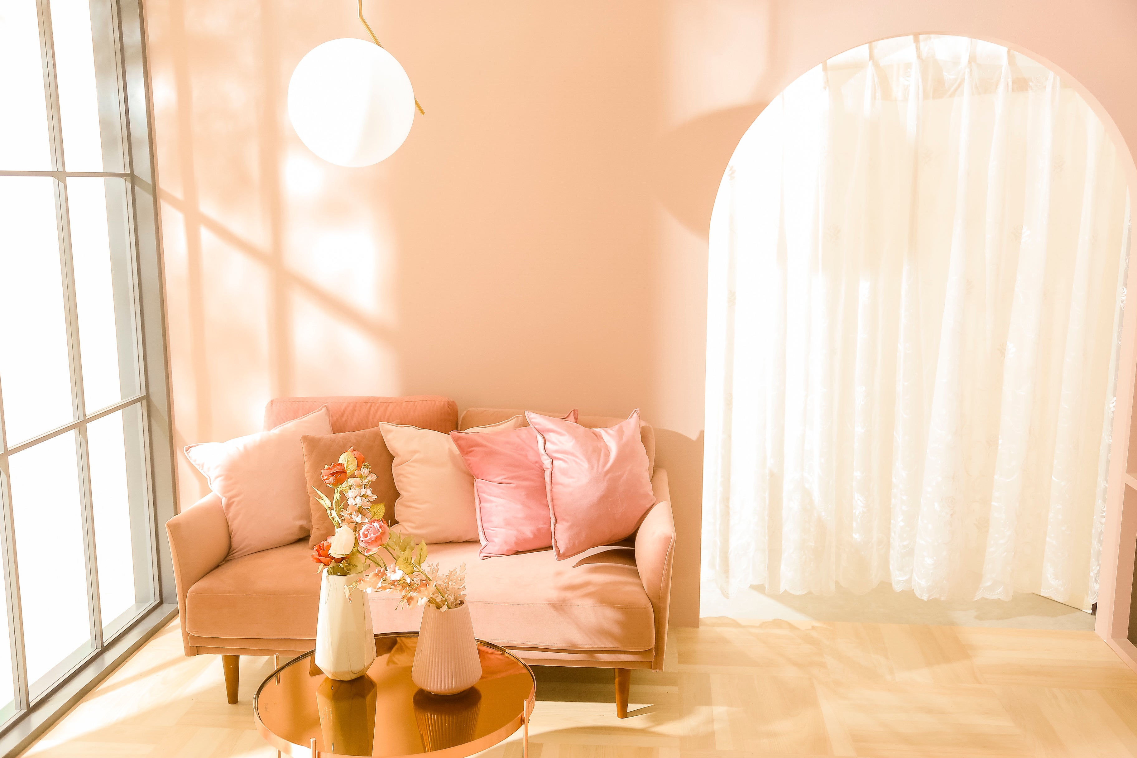 ピンク壁の可愛らしいお部屋風のセットで、くつろぎながら自然な表情をご撮影できます。