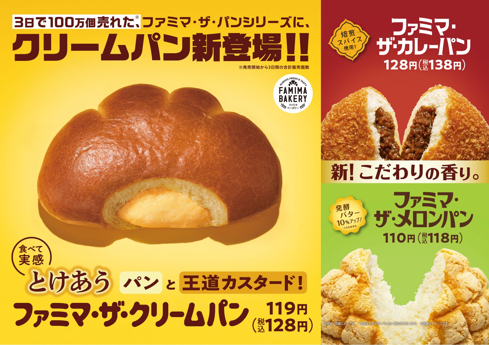 3日で100万個売れた、ファミマ・ザ・パンシリーズにクリームパンが新登場!カレーパンとメロンパンもさらに香り豊かにリニューアル!3月22日(火)より発売!
