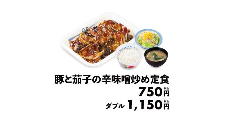 商品名 豚と茄子の辛味噌炒め定食 750円 ※お持ち帰りいただけます。お持ち帰りにみそ汁は付きません。 お持ち帰りの場合、みそ汁は別途60円でお求めいただけます。 ※税込み価格です。 ※株主優待券は「豚と茄子の辛味噌炒め定食」にご使用いただけます。ダブルにはご使用いただけません。 発売日 2023年9月26日(火)午前10時 ~ 対象店舗 一部店舗を除く全国の松屋 |