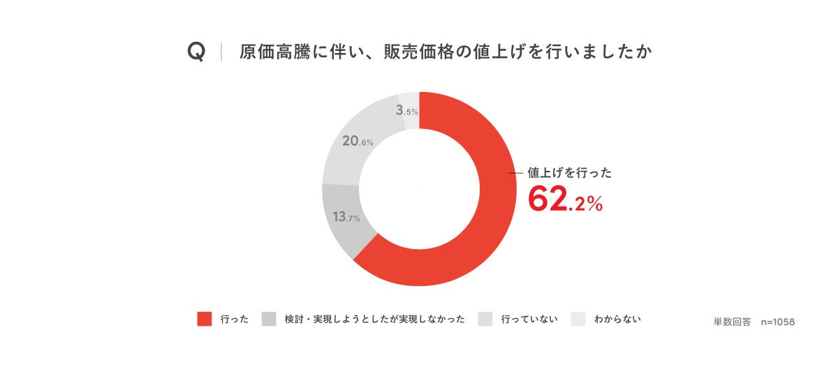 2023年の原価高騰に伴い販売価格の値上げを行ったか聞いたところ、62.2%が「行った」と回答しました。