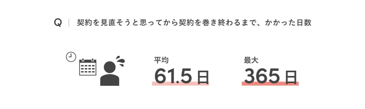 契約を見直した・見直しを検討した人にどのような課題があったか聞いたところ「契約内容に関する交渉が難しかった」が39.2%で最も多く、次いで「契約状況を正確に把握するのが難しかった」が26.8%となりました。また、契約を見直すためにかかった日数を聞いたところ、平均2カ月以上、最大で1年となりました。