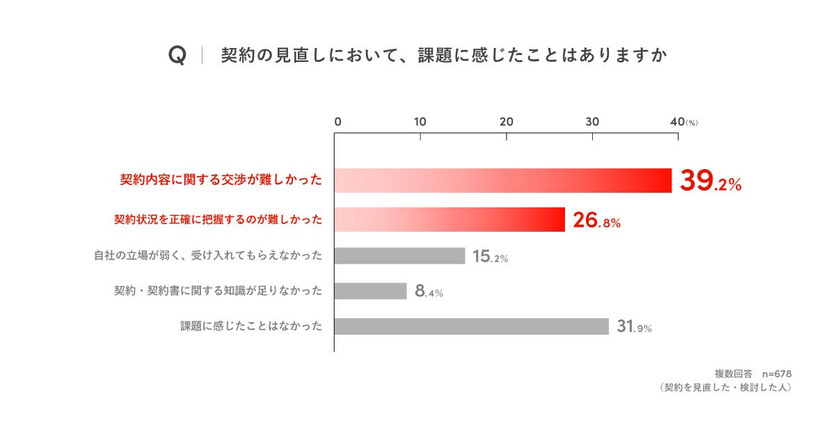 ・契約の見直しにおける課題は、「契約交渉」、「契約状況の正確な把握の難しさ」が上位に。契約見直しまで最大1年かかった事例も