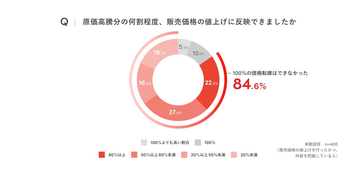 値上げを実施した人に対して、原価高騰分の何割程度を値上げに反映できたか聞いたところ84.6%が「100%の価格転嫁はできなかった」と回答しました。2023年の原価高騰分が依然として企業の負担となっていることが明らかになりました。