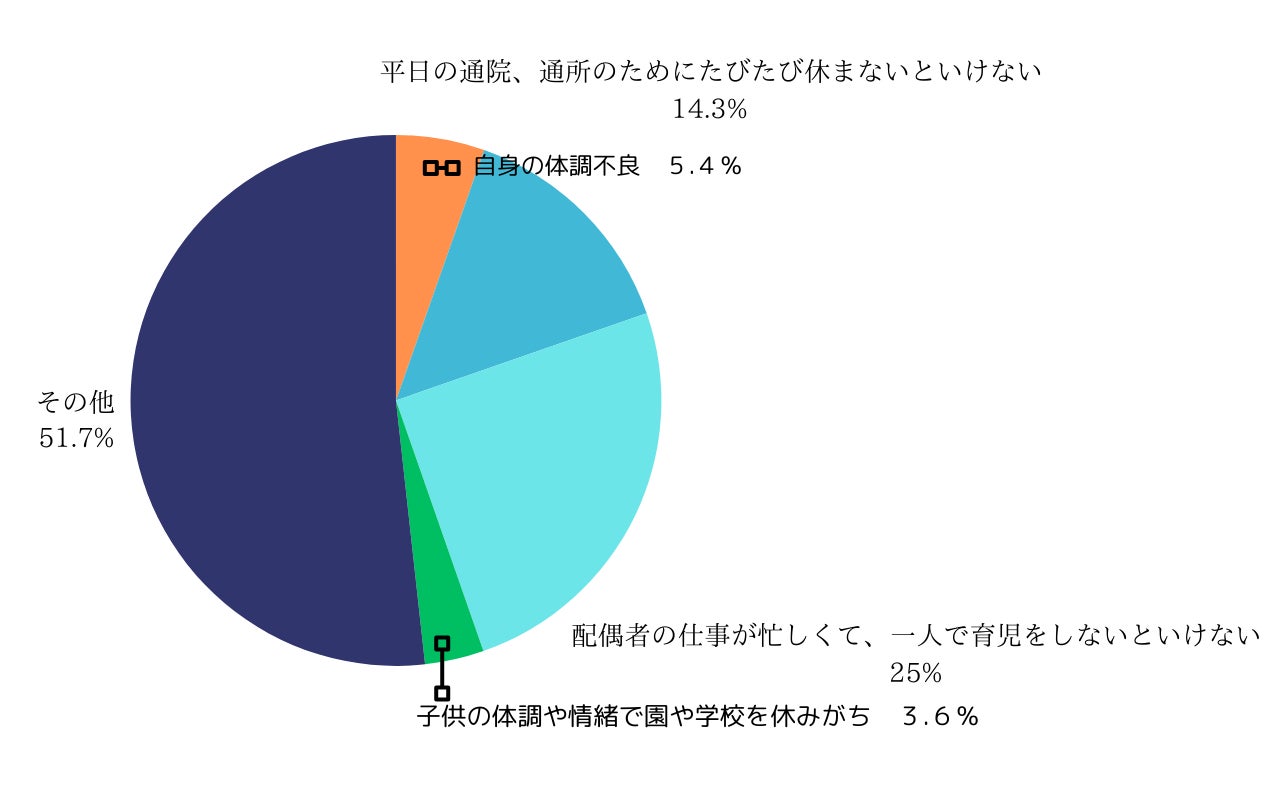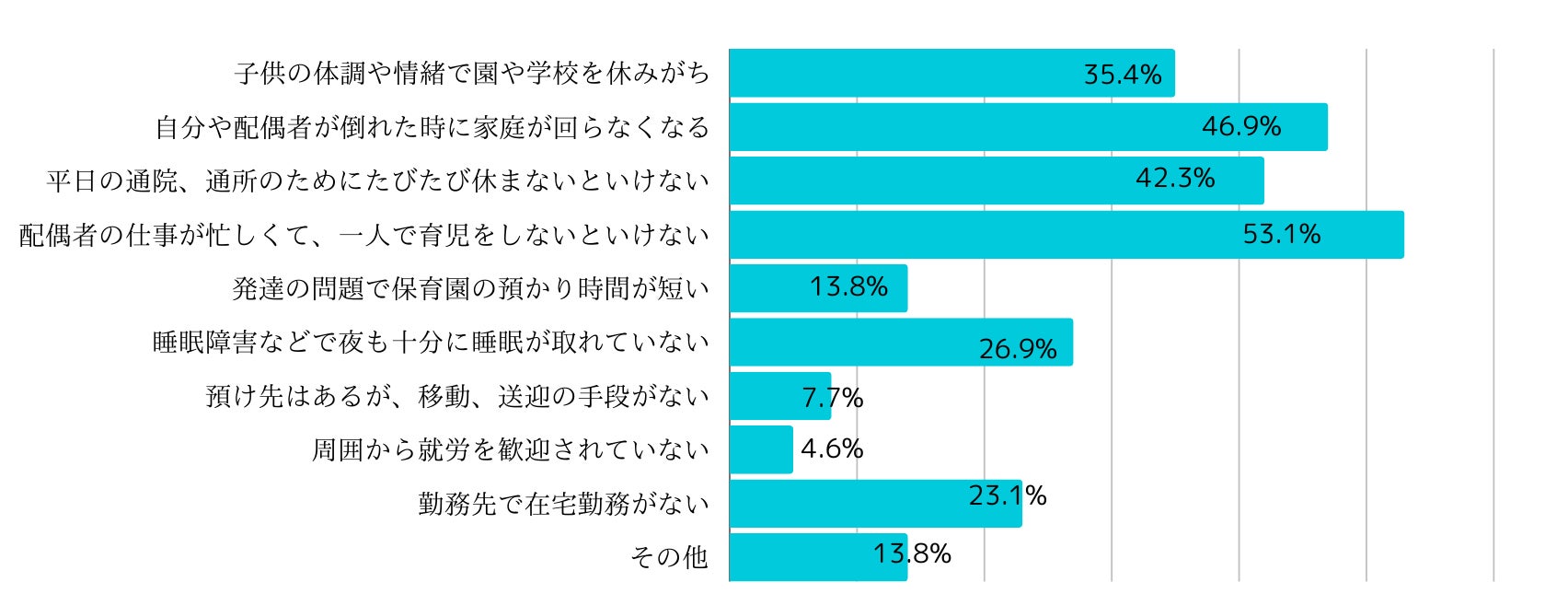 半数以上の家庭で、ママが1人で育児をしなければいけない状況になっています。また、子どもの病院への通院や療育施設への通所のため、仕事を休まざるを得ない状況下にあるケースも4割を超え、とても高い水準となっています。