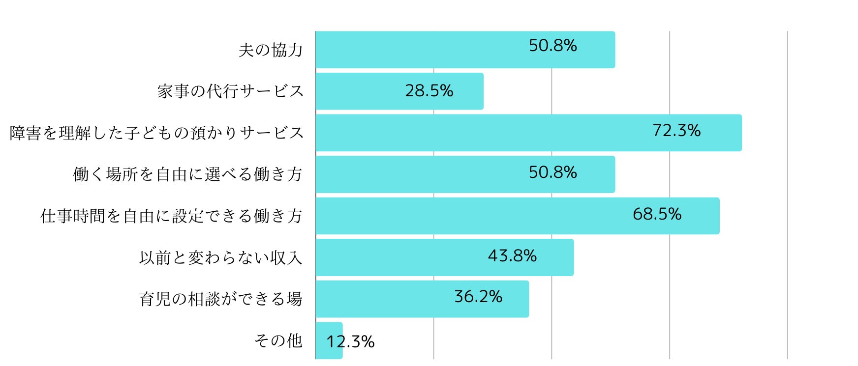 理想の環境として、働く場所を自由に選べる、時間を自由に設定できる働き方、そして障害を理解した子どもの預かりサービスの拡充などが求められていることがわかりました。