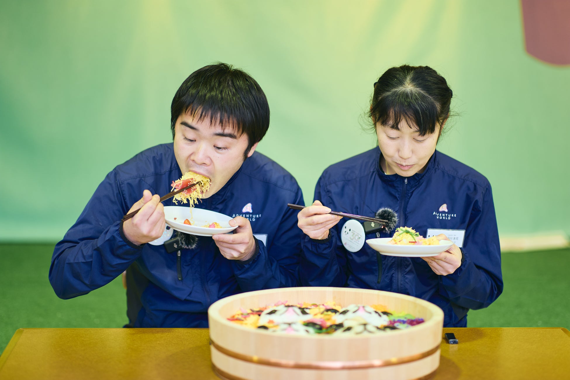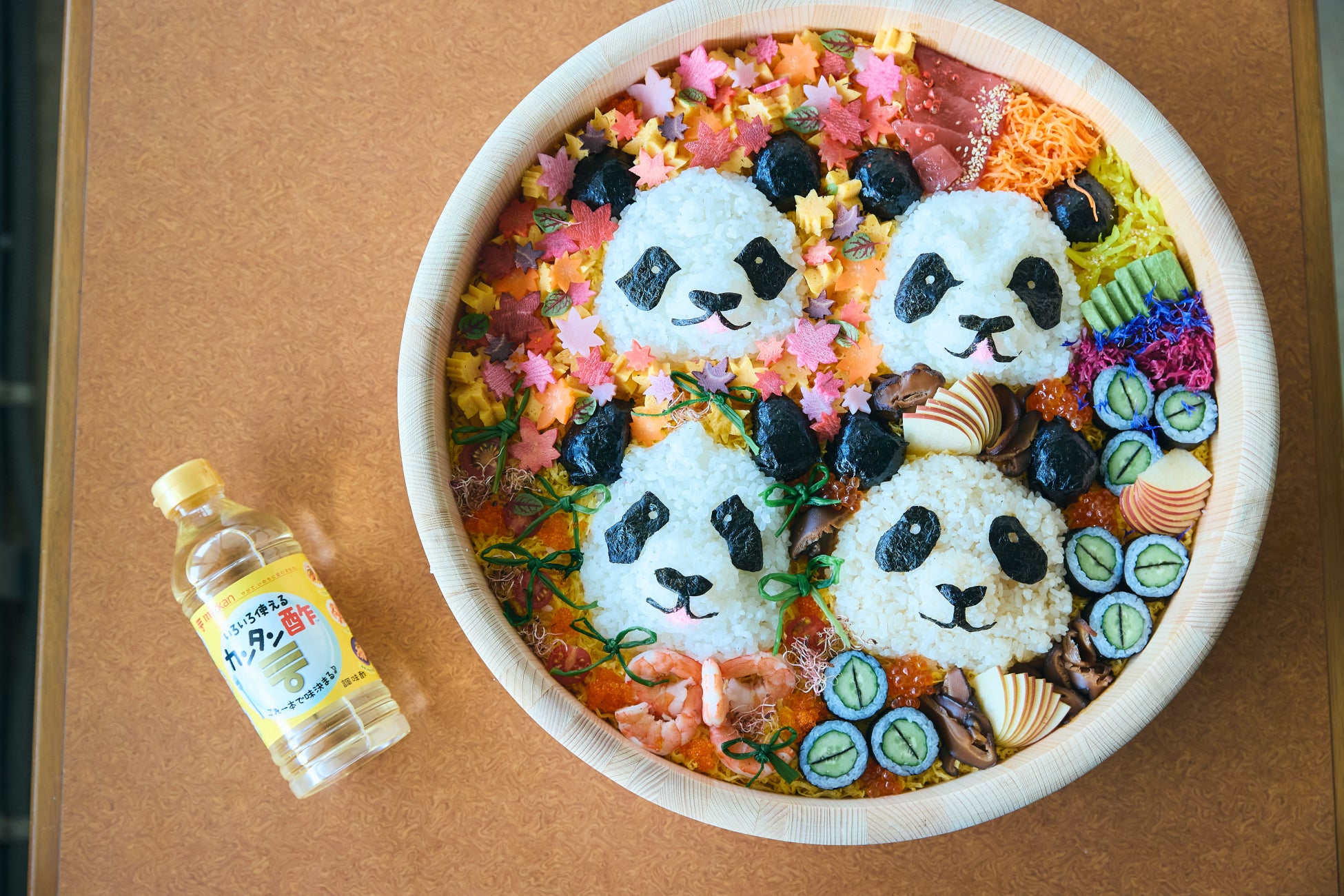 凹んでない課と園長が「どうやったらスタッフの方は元気になるのだろう」「どうやったら全国の方にアドベンチャーワールドのパンダの魅力を知ってもらえるのだろう」と考えた結果、アドベンチャーワールドにいる4頭のパンダを模した凹メシ『良浜・結浜・彩浜・楓浜ちらし寿司』を作り、直接スタッフの方にプレゼントすることに。4頭それぞれの耳の形や輪郭などの特徴を再現し、さらに“楓”浜には楓の飾り、“結”浜にはリボンの飾りなど、それぞれの名前にちなんだモチーフをつけた可愛らしいちらし寿司を作り振る舞いました。このカンタン酢™を用いたちらし寿司によってスタッフの方を元気づけることに成功しました。詳細はぜひ動画でご確認ください。
