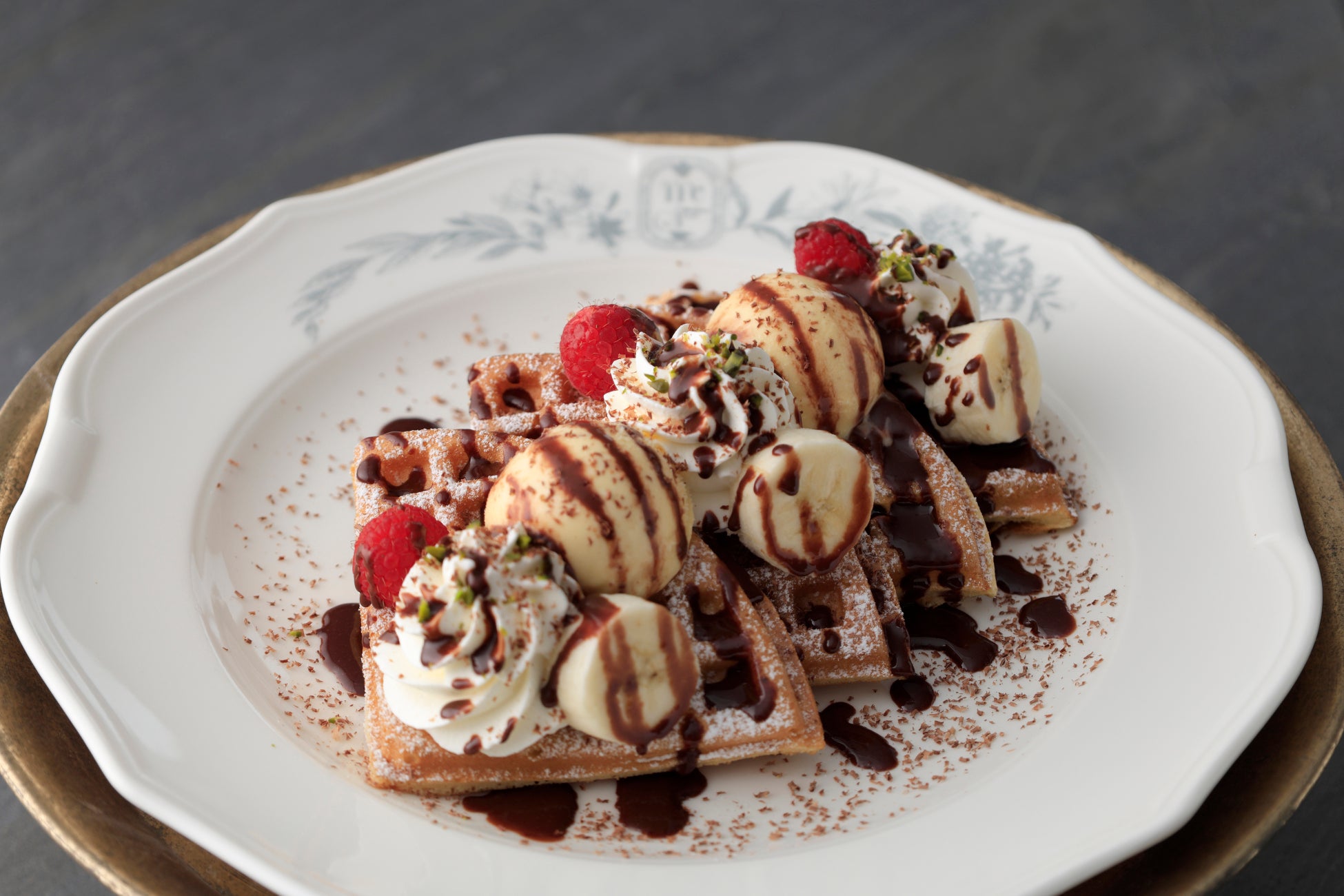 カカオ70%の芳醇なチョコレートを使った自家製ガナッ シュソースをたっぷりと使い、バニラアイス、ホイップクリーム、バナナ、ラズベリーを添えた大人なショコラワッフルです。フランスのチョコレートメーカーのチョコレートを使用した、香り高くビターな味わいです。