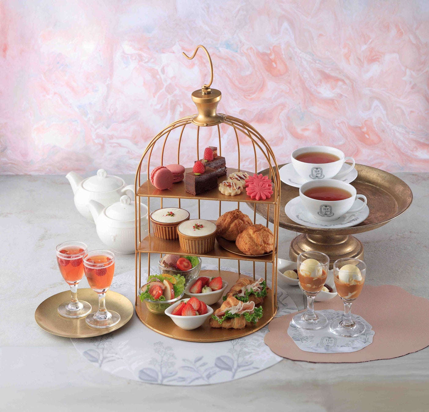 紅茶を味わうための優雅な「アフタヌーンティーセット」を大幅にリニューアルしました。「フロ マージュダンジュ」などの7種類のスイーツと、「いちごのカプレーゼ」などの3種類のセイボリーが、ティータイムを華やかに彩ります。ドリンクは合計3品ご用意しており、ウェルカムティーとして「ベリーティーソーダ」、メインの紅茶は、12種類の茶葉が入ったテイスティングボックスから1種類お選びいただけます。ボックスには香り高い本物の茶葉が入っており、その豊かな香りをテイスティングしてセレクトする特別な体験をご用意しました。さらに、アレンジティーを含む約30種類のドリンクメニューからお好きな1品をお楽しみいただけます。五感で楽しむ体験型アフタヌーンティーをぜひご堪能ください。