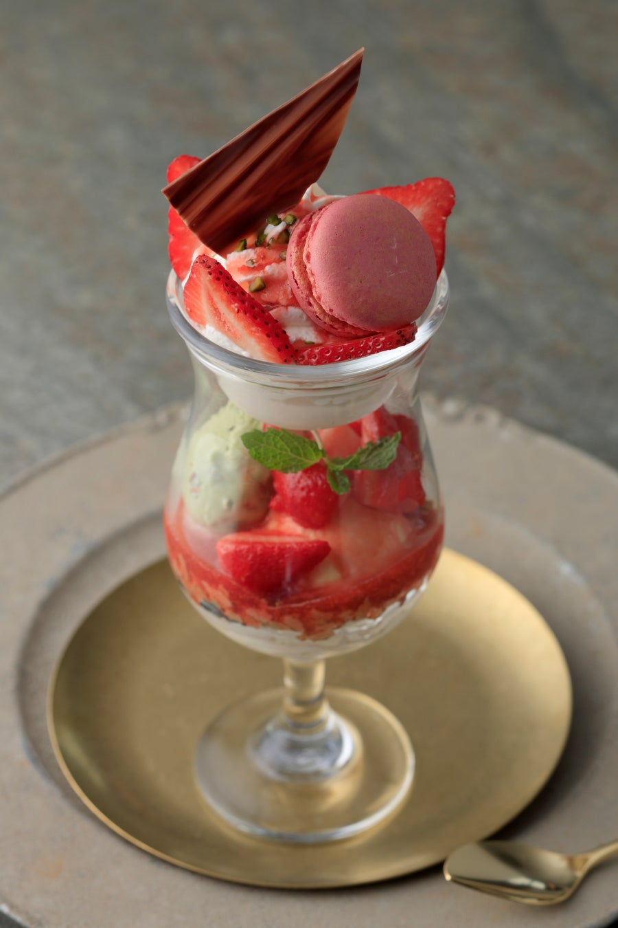 グラスとカップにセパレートした華やかなパフェグラスで贅沢な気分を味わえる、繊細で上品なご褒美パフェです。甘酸っぱいいちごをピスタチオアイスやチーズクリームホイップ、自家製いちごソースとともに仕立てました。いちごのおいしさを引き立てる繊細な素材の味わいを、自慢の紅茶と一緒にお楽しみください。