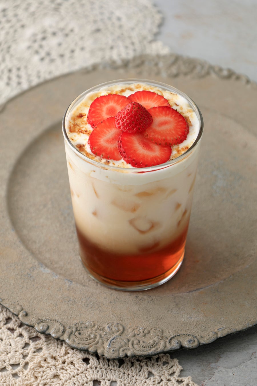 甘く華やかな香りの「ストロベリー&ローズ」の紅茶と自家製ティーシロップに、コクのあるミルクとなめらかなホイップクリームを加えました。表面に振りかけたきび砂糖を香ばしくブリュレし、その上には花に見立てたいちごで彩りを添えました。クリーミーな口当たりとすっきりとした味わい、いちごとローズの優雅な香りを感じられる冬限定のミルクティーです。