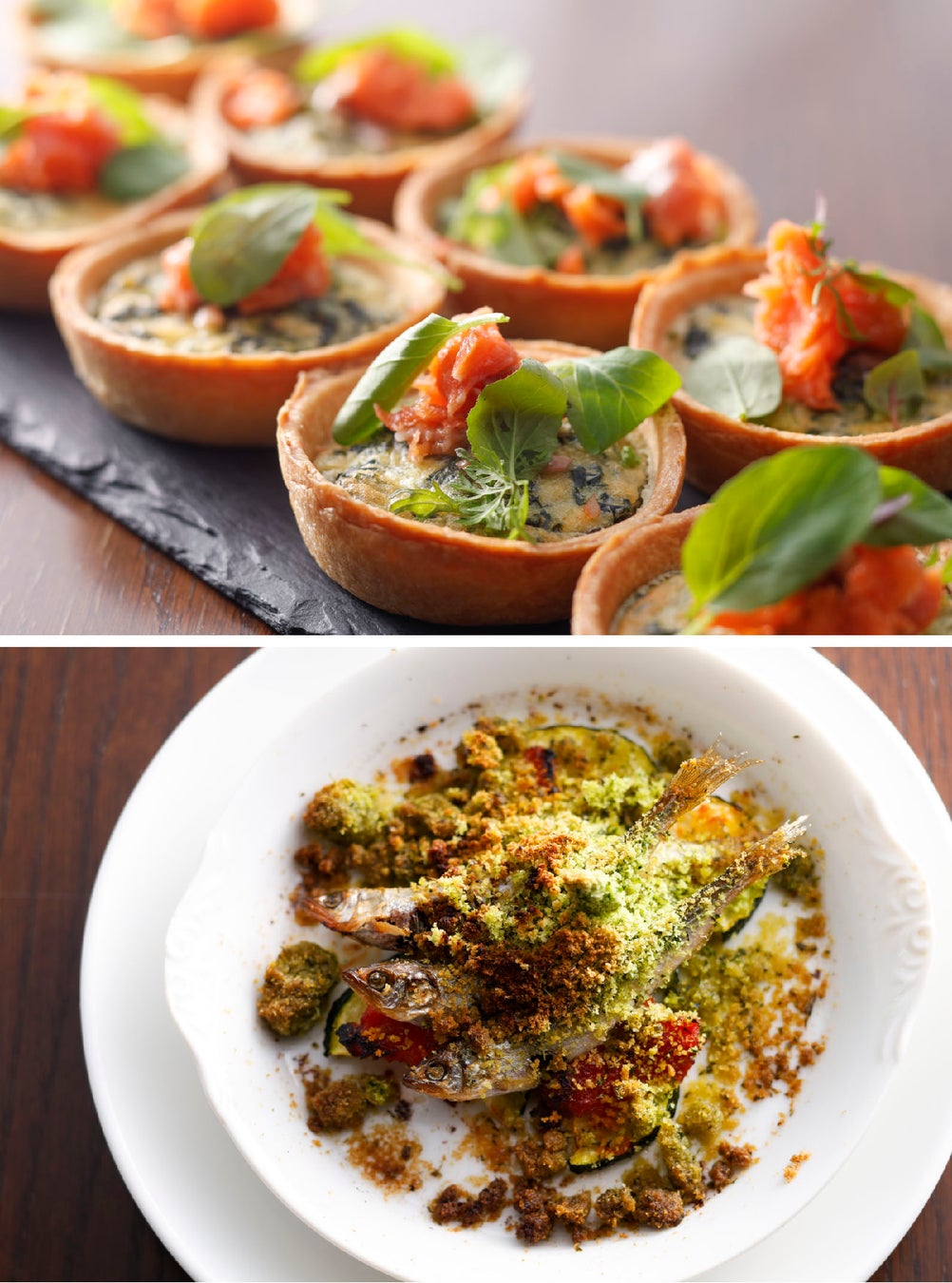 クラブラウンジでは、時間ごとに5回のフードプレゼンテーションをご用意。ティータイムにお召し上がりいただける「滋賀県産トラウトのコンフィとほうれん草のセイボリータルト」は、滋賀県産の米粉や卵を使用し、【ニジマス】を一口サイズのタルトに仕上げました。その他、オードブルタイムには、【小鮎】を使った「湖魚のオイルサーディン風 香草パン粉焼き」などを提供。セルフ形式でお好きなだけお召し上がりいただけます。「湖魚グルメ」以外にも、近江牛や滋賀県産棚田米など湖国の恵みを味わえる専用朝食もお楽しみください。