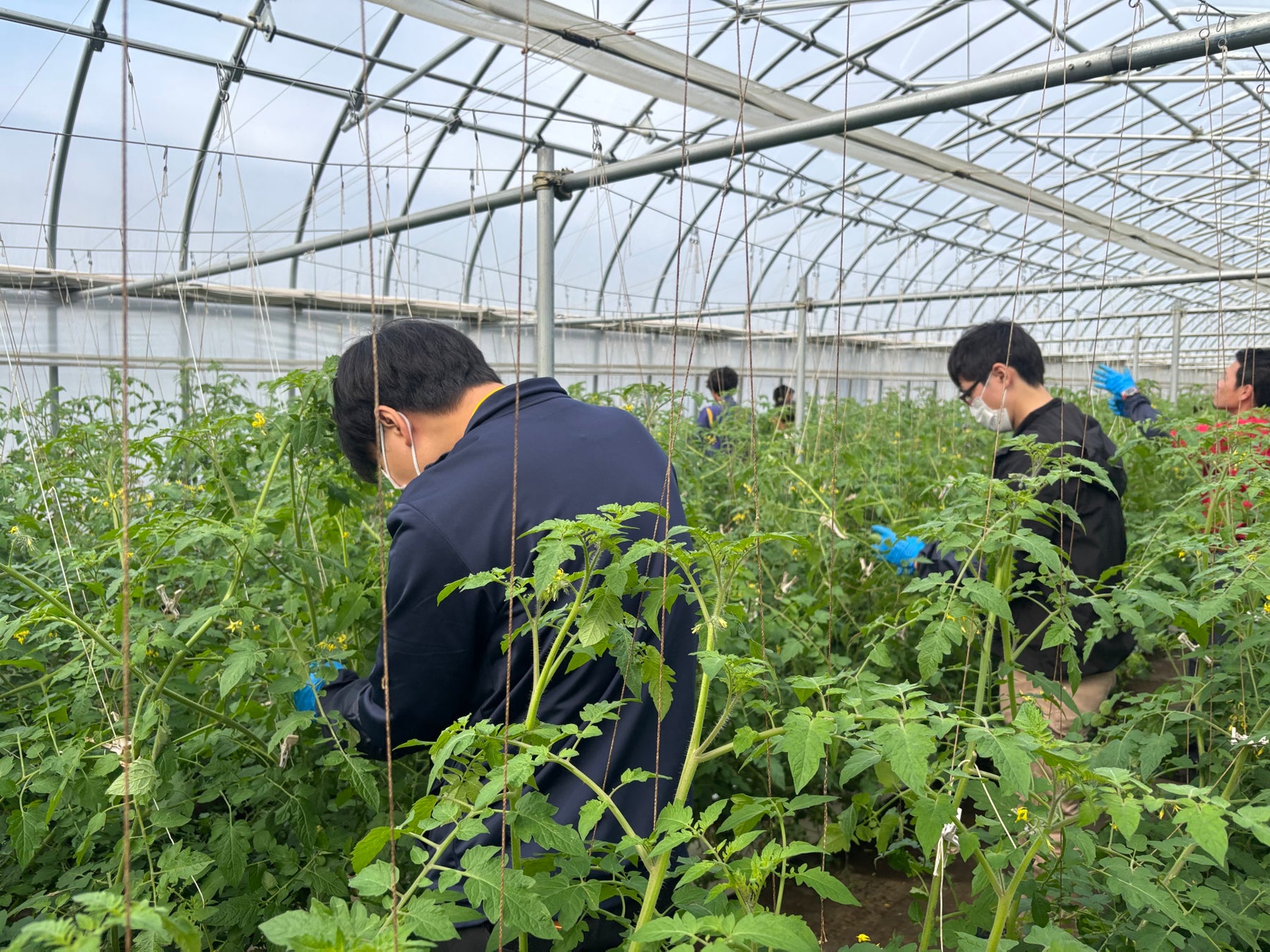 この講座は(公財)滋賀県農林漁業担い手育成基金と平和堂が共催し、滋賀県が後援するものであり、農業に関心を持つ多くの方にご参加いただけるよう参加者を平和堂ホームページ等で広く募集しました。当日は主に農業経営をしてみたいと考えている方10名に、滋賀県内外よりご参加いただきました。参加者は座学で、トマトの歴史や害虫に関することといったミニトマト栽培の基礎知識を学んだり、就農に関する支援制度の案内を受けたりしたのち、ビニールハウスで摘葉や収穫など、栽培に必要な作業を体験しました。参加者からは「現場を知ることができてよかった」「他の作物も開催してほしい」と大変好評で、2回目、3回目と続く講座を希望する声もありました。