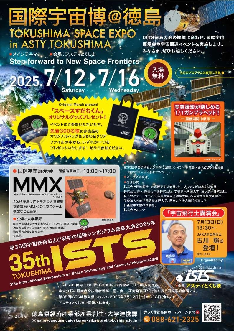 徳島県では、日本最大の宇宙に関する国際学術会議「宇宙技術および科学の国際シンポジウム(ISTS)」の開催に併せ、7月12日(土)及び7月13日(日)(※展示は12日~16日)、ISTS会場の「アスティとくしま」において、一般参加が可能な宇宙イベント「国際宇宙博@徳島 TOKUSHIMA SPACE EXPO」を開催します。