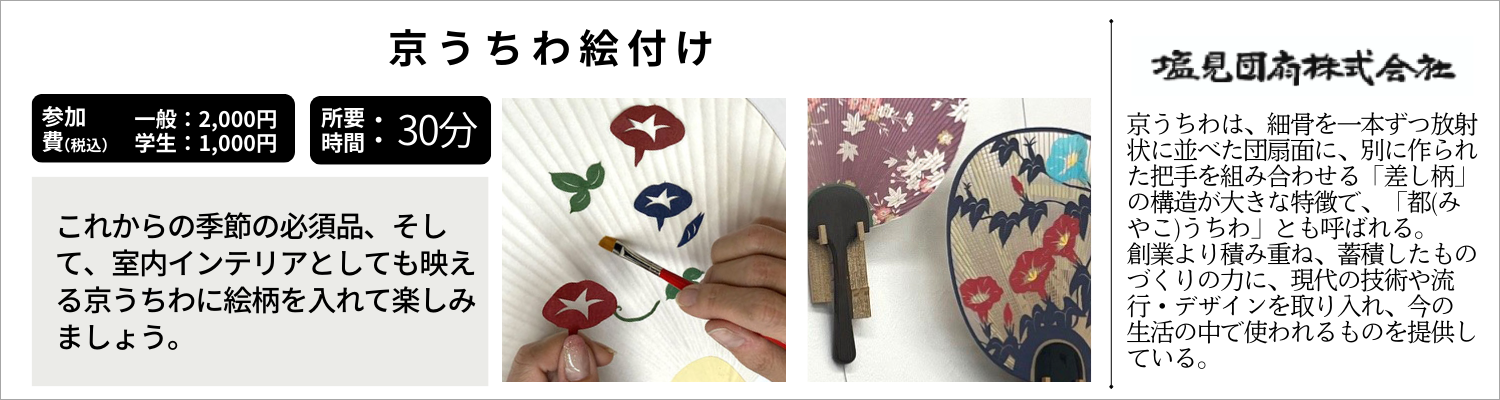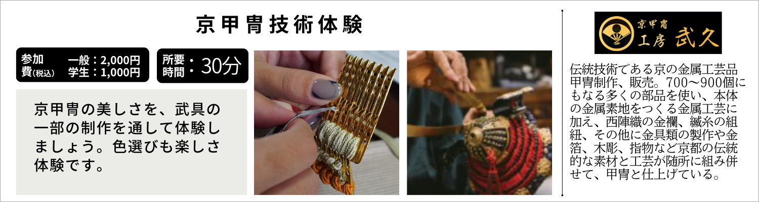 京都市では、京都市伝統産業活性化推進条例(平成17年10月15日施行)に基づき、74品目を京都市の伝統産業に決定しています。その中から、5品目の伝統産業事業主様にご協力いただきました。ワークショップでの制作や指導は、学生ではなく職人が実施します。体験申し込みは、当日会場にて随時受付となります。なお、学生料金は学生証の提示が必要です。