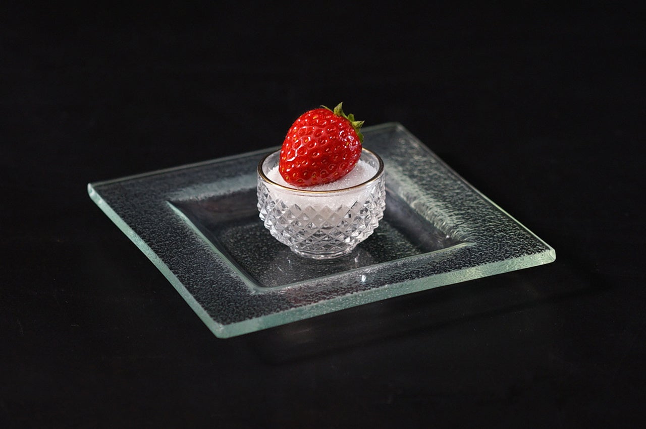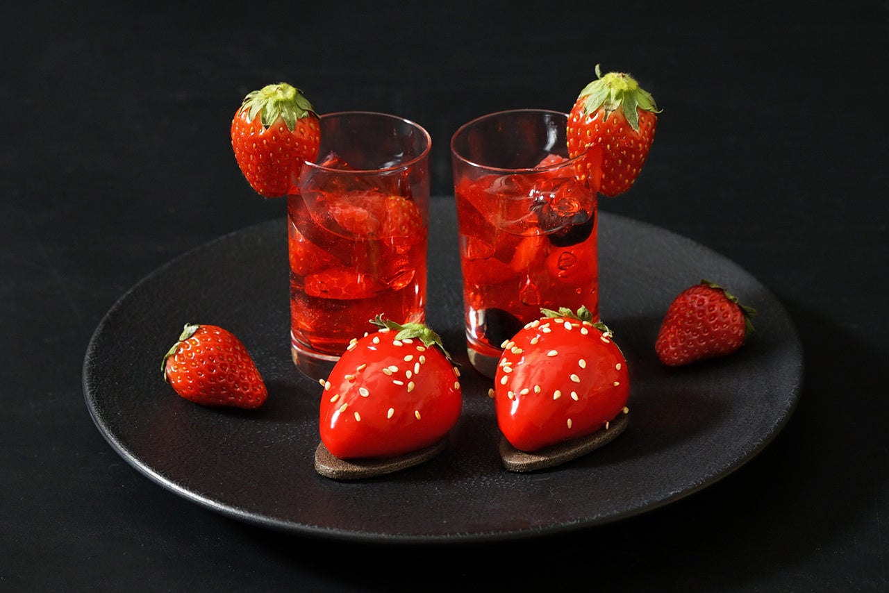 苺の香り漂う豆乳クリームに赤紫蘇で甘塩っぱいマリネした苺を添えた一品です。