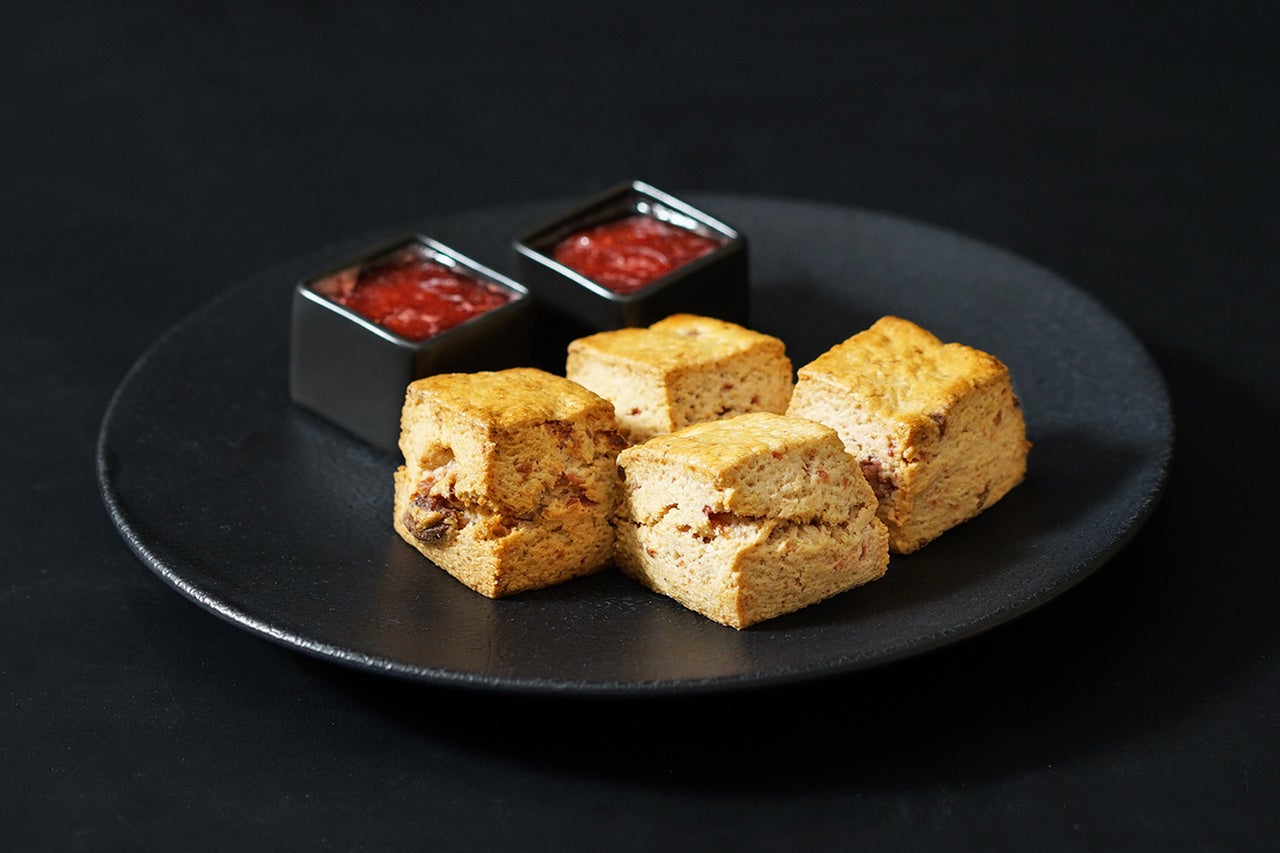 あまりんを練りこんだ自家製スコーン。苺チョコレートチップやフリーズドライの苺パウダーを練りこみ、苺尽くしのスコーンです。外はサクッと中はしっとりとしたスコーンです。自家製あまりんのジャムとクロテッドクリームと一緒にお召し上がりください。