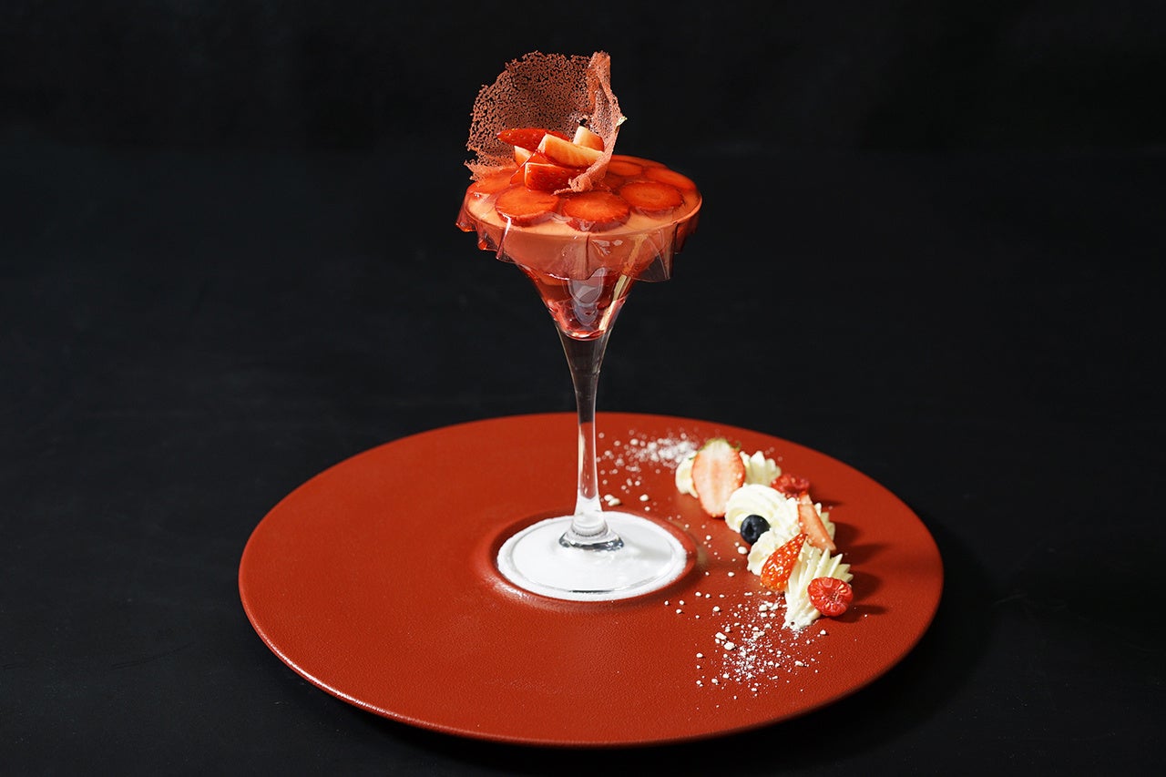 カクテルグラスの中にはサクサクとしたチョコレートパフ、あまりんのジュレ、フレッシュあまりん、パンナコッタ、マスカルポーネのクリームが層になっており、その上にはたっぷりのあまりんスライスを乗せフリルを表現したライチとザクロのシートジュレで閉じ込めました。トップに薄い苺のアメを乗せて仕上げております。