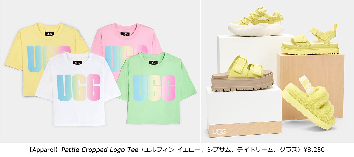 Tokyo ( 2022年4月6日 ) –南カリフォルニアを拠点とするグローバルライフスタイルブランドのUGG (a division of Deckers Brands [NYSE: DECK])は、UGGのアパレルからフットウエアまで、世界で人気のスタイルを2022年春のトレンドカラーで揃えた、カラフルなスプリングコレクションを発表します。短い着丈が旬なバランスに見せてくれるこの春注目のクロップド丈のフーディとグラデーションカラーのUGGグラフィックロゴ入りTシャツをはじめとして、お揃いのスウェットパンツに靴下、アイコニックなUGGの軽くて履き心地の良いサンダルや、アクティブなシーンにも大活躍のスニーカーやスポーツサンダルなど、気分も華やぐトータルコーデが楽しめるラインナップが勢揃い。