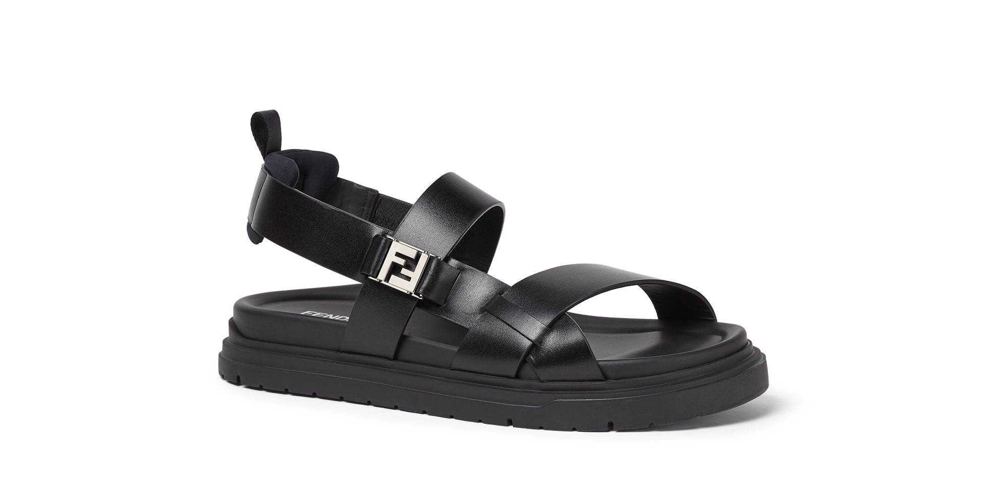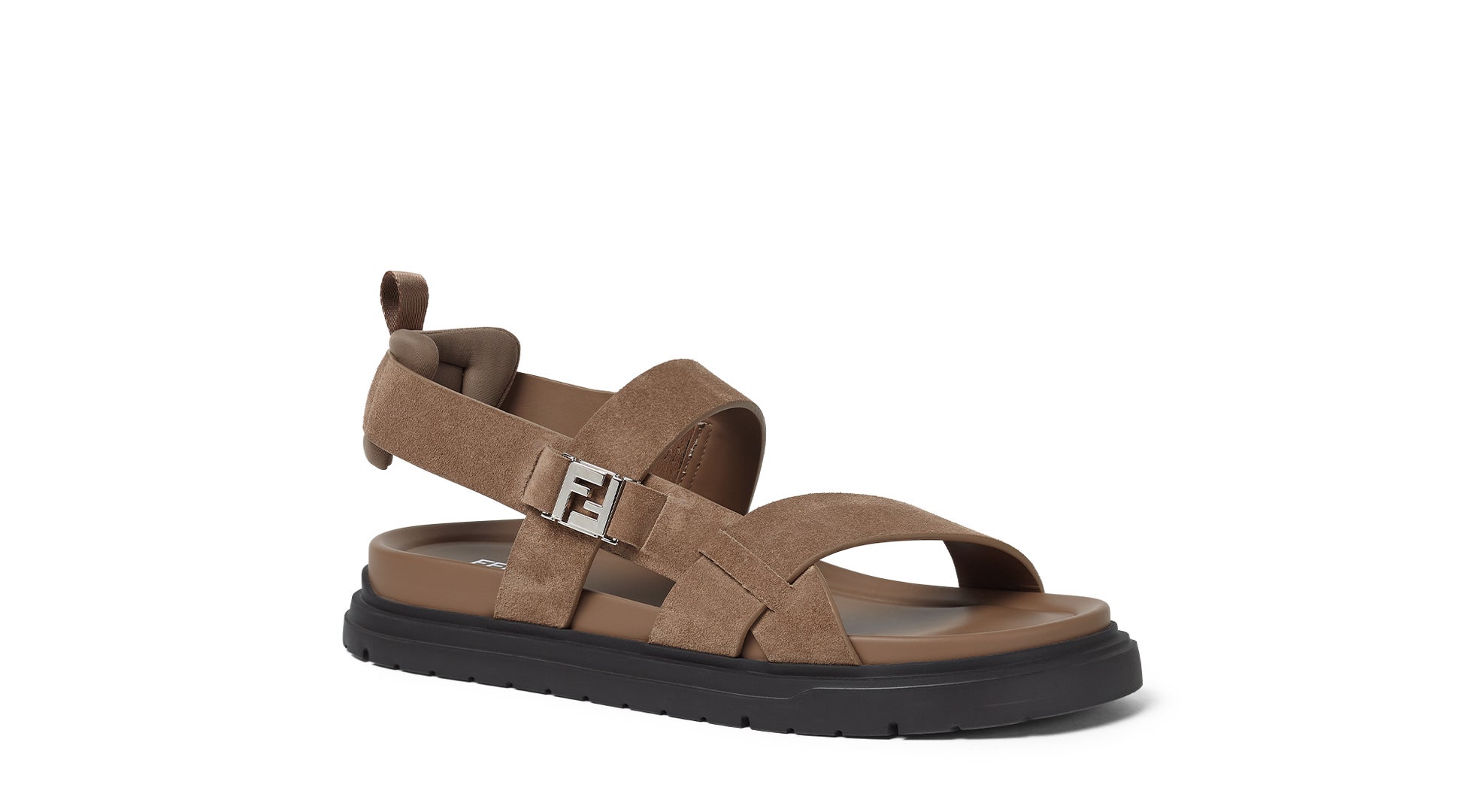 「FF」サンダルは、上質なブラックカーフレザーと、エレガントなブラウンスエードの2色展開。どちらも編み込まれたレザーバンドと、サイドにあしらわれたメタルの「FF」ロゴバックルが、洗練された印象を醸し出します。パッド入りのヒールクッションと軽量ラバーソールが快適な履き心地を実現させ、かかとにはエンボス加工による「Fendi」ロゴがさりげなく施されています。