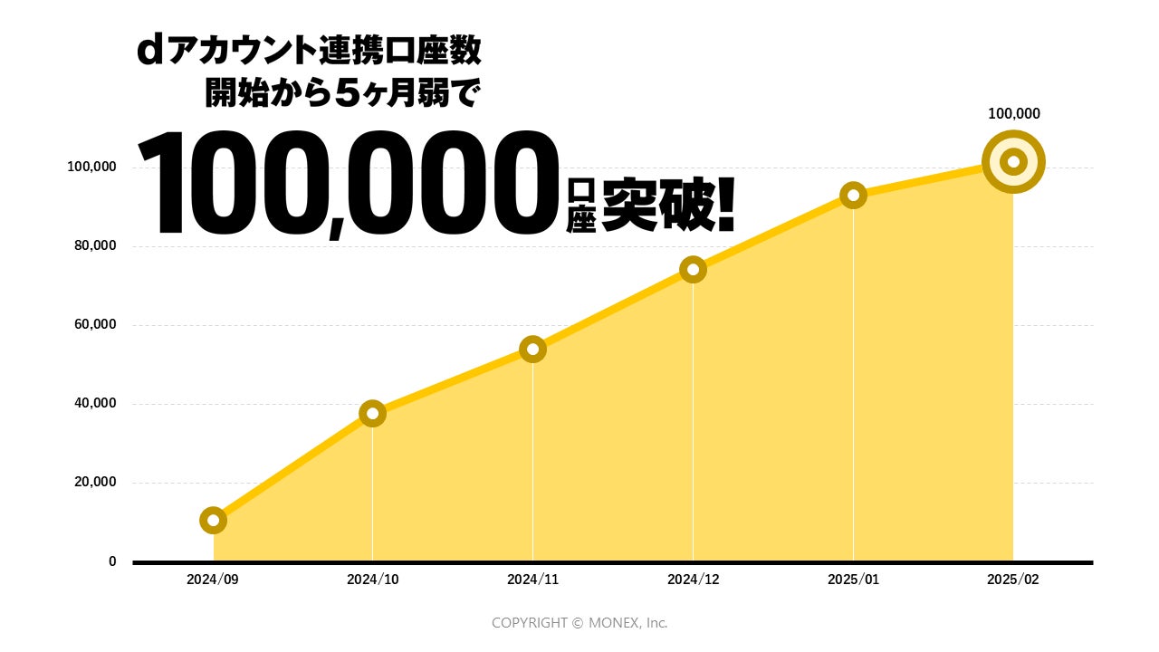 マネックス証券株式会社(本社:東京都港区、取締役社長執行役員:清明祐子、以下「マネックス証券」)は、マネックス証券の証券総合取引口座と株式会社 NTT ドコモ(本社:東京都千代田区、代表取締役社長:前田義晃、以下「ドコモ」)が提供する「dアカウント🄬」を連携した口座数が、連携サービス開始後5ヶ月弱で10万口座を突破したことを、お知らせいたします。