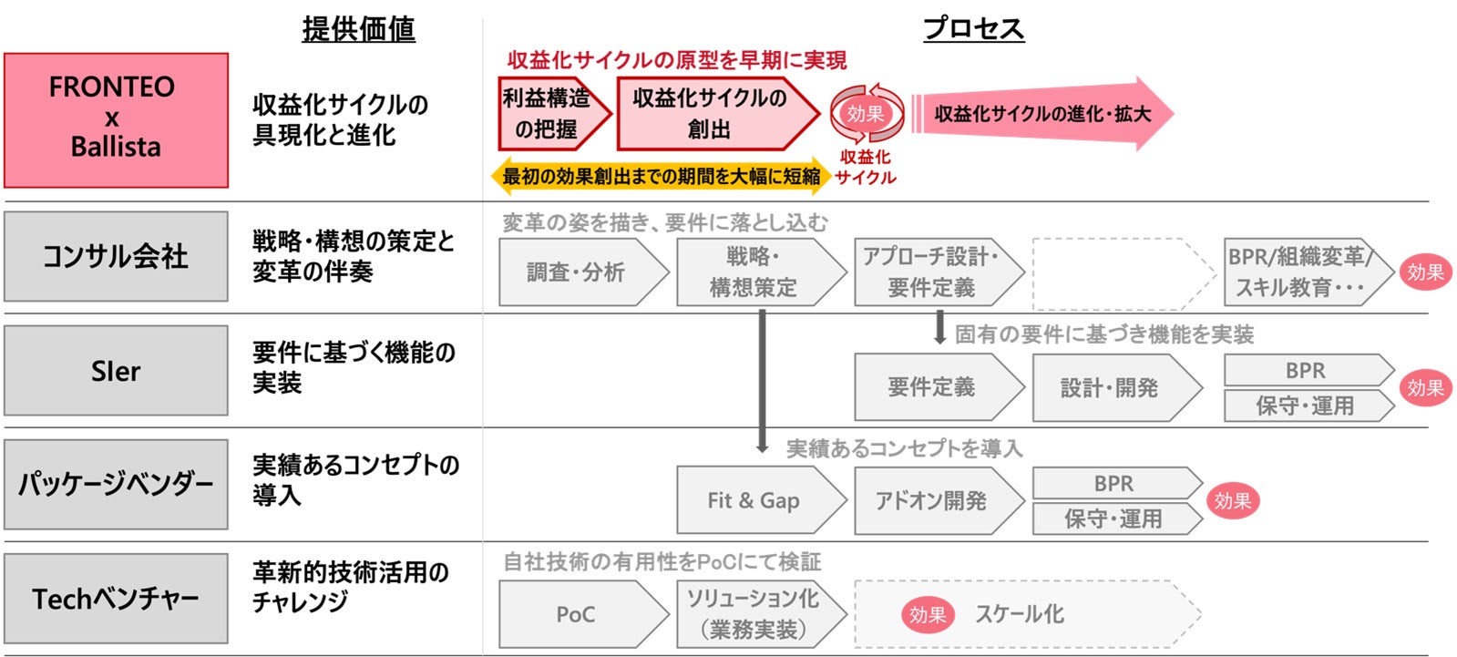 こうした課題に対し、Ballistaのコンサルティング機能とFRONTEOのAIソリューションを活用することにより、両社は無駄を排したコンサルテーションと構造化データ・非構造化データの枠を超えた具現化力を駆使した筋肉質なアプローチで、構想だけでない実態のある変革を推進し、収益性に直結する効果創出を実現します。