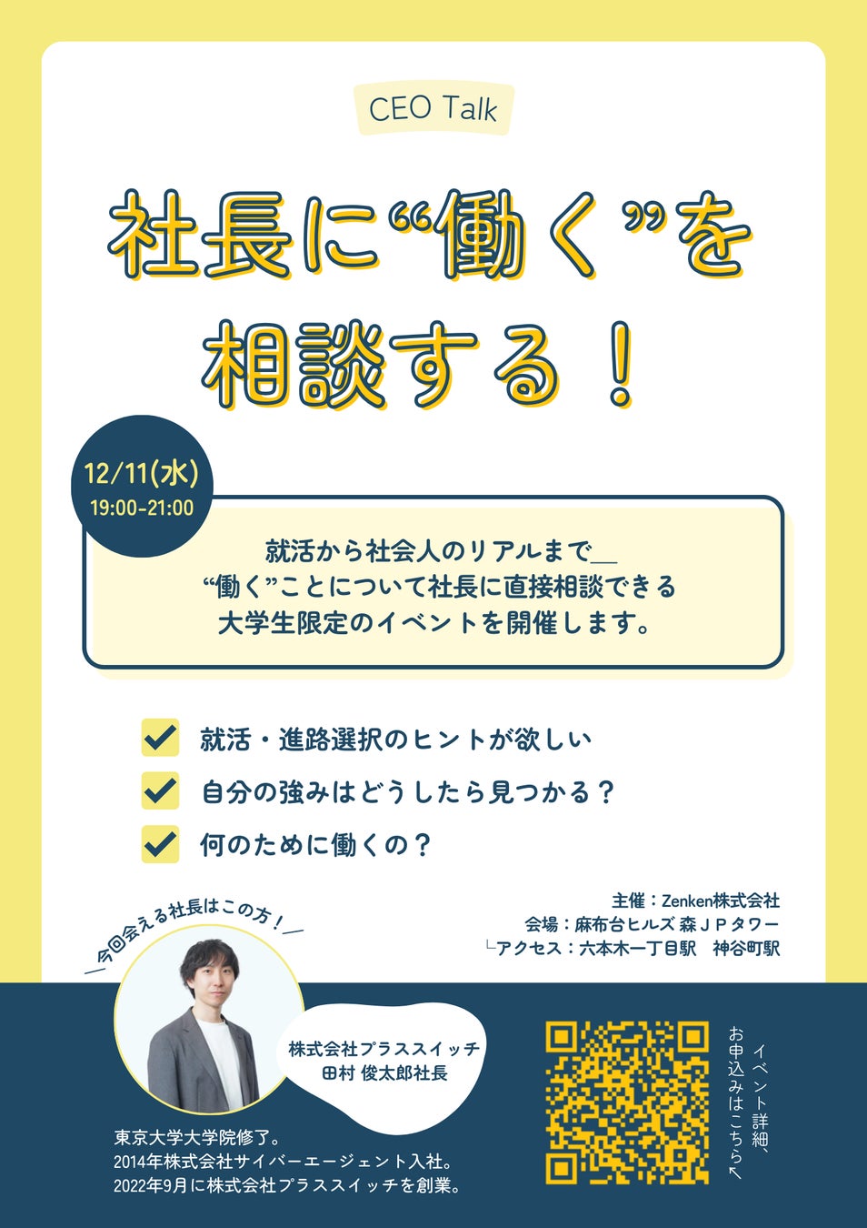 Zenken株式会社(本社:東京都港区、代表取締役社長:林 順之亮、以下 Zenken)は、12月11日、経営者と学生の交流イベント「CEO Talk」(シーイーオートーク)を無料開催いたします。