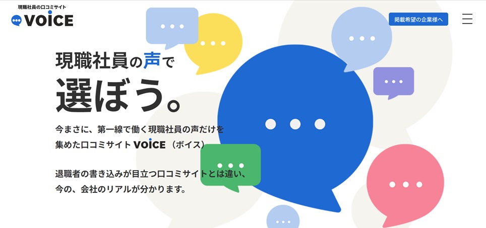 求職者にとって重要なのは「現職社員が、その会社で働き続けている理由(=やりがい・事業への誇り・会社の魅力など)」なはず。そこで私たちは、現職社員の口コミに特化したサイト「VOiCE」(ボイス)を立ち上げました。