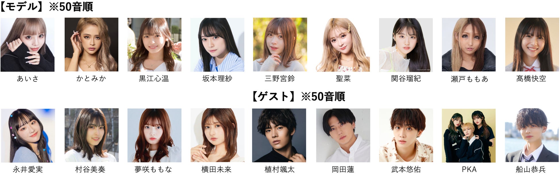 さらにゲストには、注目の若手俳優植村颯太、武本悠佑、ELLEgirl「UNI boys」の岡田蓮、日本一のイケメン高校生を決める「男子高生ミスターコン2022」グランプリ船山恭兵、そして、SNS総フォロワー数170万人超え!ティーンに絶大な人気を誇る幼馴染男女3人組の動画クリエイターで、アーティストとしての活動も注目を集めているPKAらが決定!各界で輝きを放つ、新時代を担う豪華出演者たちが集結します。
