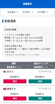 このたび提供を開始する、リアルタイムでの為替取引サービスでは、取引受付時間内であればいつでもお好きなタイミングで為替取引を行うことができるようになります。取引後の外貨は、すぐに外国株式(米国株式、中国株式、シンガポール株式)、外貨建債券、外貨建MMFといった外貨建商品の買付にご利用いただけます。また、為替取引画面も刷新し、スマートフォンから視認性の高い画面で為替のレート確認・取引・注文照会等を行うことができるようになり、初めてのお客さまにもスムーズに為替取引を行っていただけるようになります。