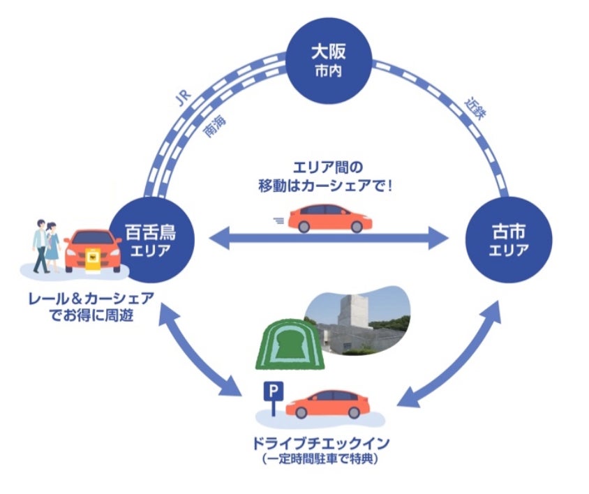 主な取組みとしては、「仁徳天皇陵古墳」や「応神天皇陵古墳」などの対象スポットを訪れ、一定時間駐車することで特典が得られる「ドライブチェックイン」のほか、古墳について学べる施設や地域のグルメが楽しめる周辺エリアの観光スポットをタイムズカーのWEBで紹介します。