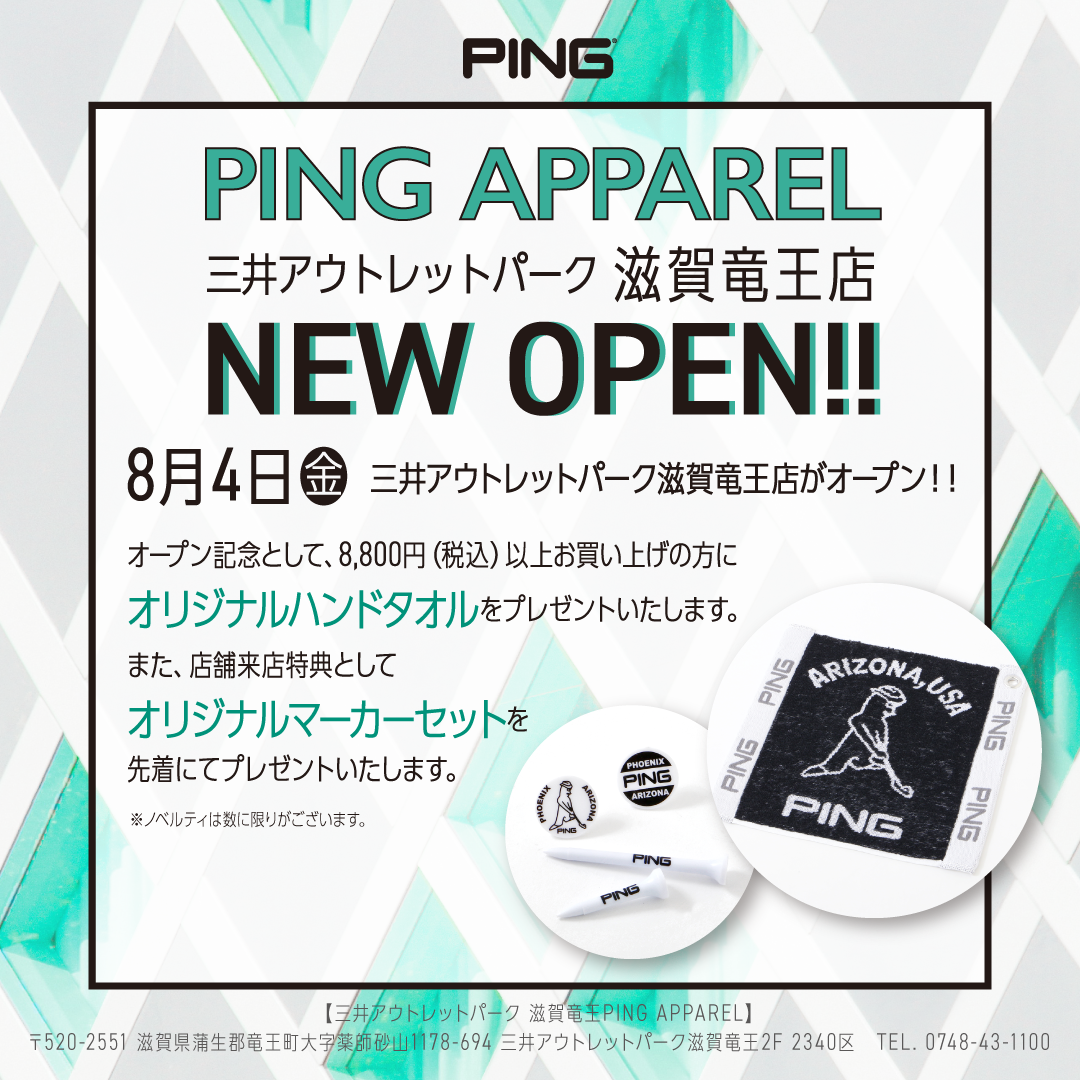 オープン記念として店舗来場者には先着にてオリジナルマーカーセットをプレゼントいたします。またPING APPARELを8,800円(税込)以上お買い上げの方には先着順でPINGオリジナルハンドタオルをプレゼントいたします。