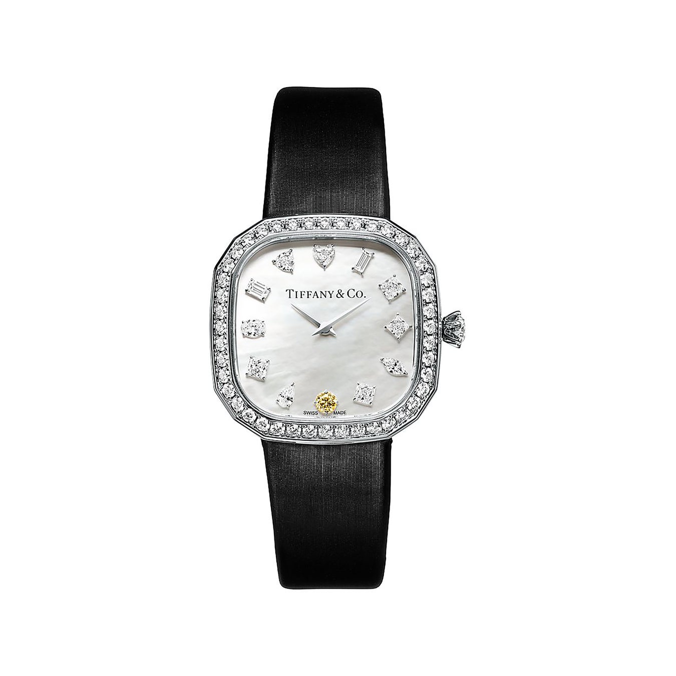 マザー オブ パールのインデックスに、時間を示す印としてセッティングされているのは、11種類の異なるシェイプのダイヤモンド(バゲット、クッション、ティファニー トゥルー、マーキス、アッシャー、ハート、ペア、オーバル、エメラルド、トライアングル、プリンセス)と、6時の位置には伝説の「ザ ティファニー ダイヤモンド」に象徴されるブランドのアイコニックなイエロー ダイヤモンドが施されています。こうした様々なカットのダイヤモンドを施した文字盤は、1960年代から1970年代にかけてティファニーが展開した一連の広告ビジュアルに着想を得ています。