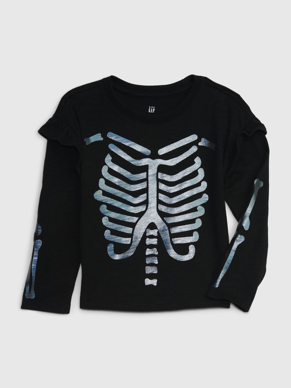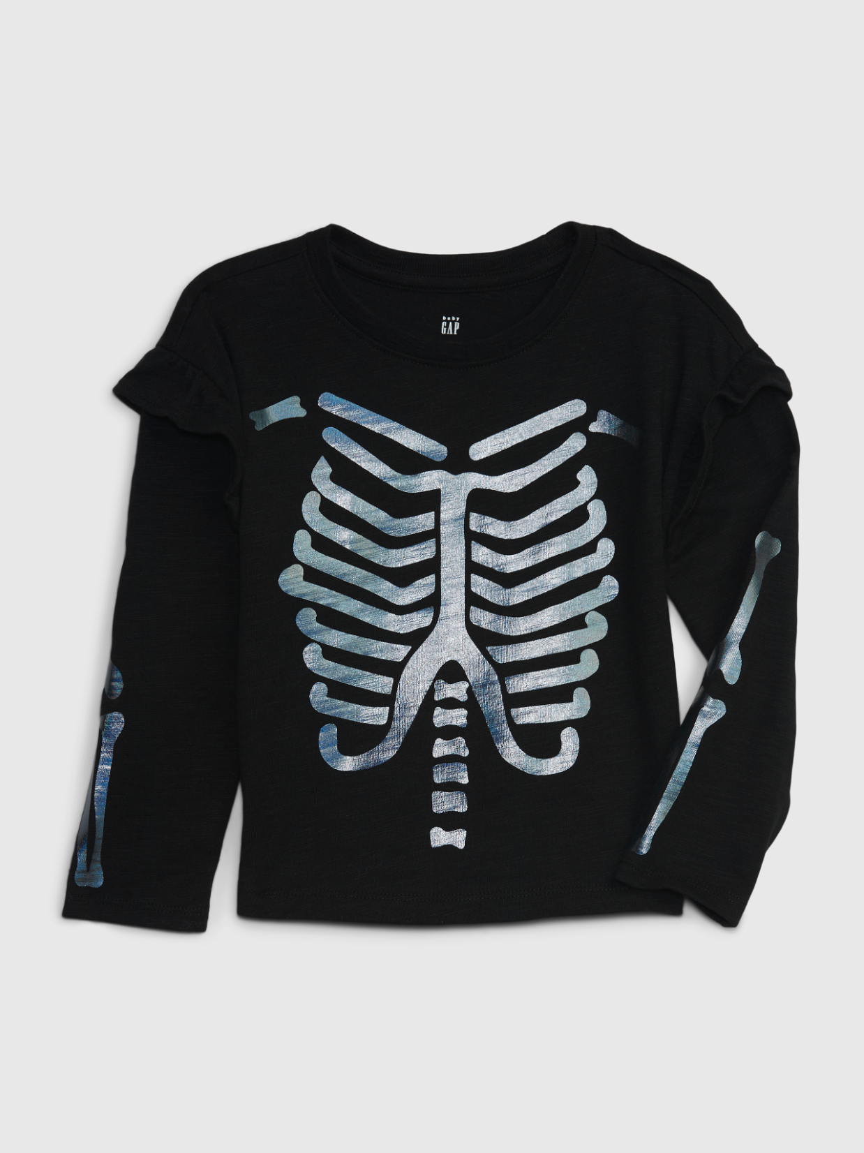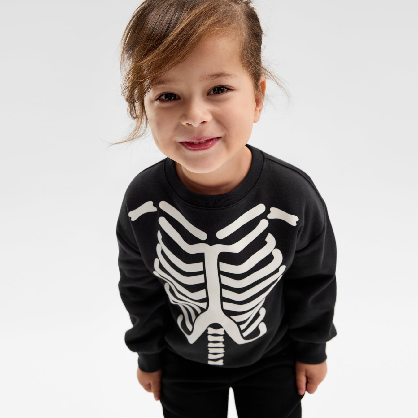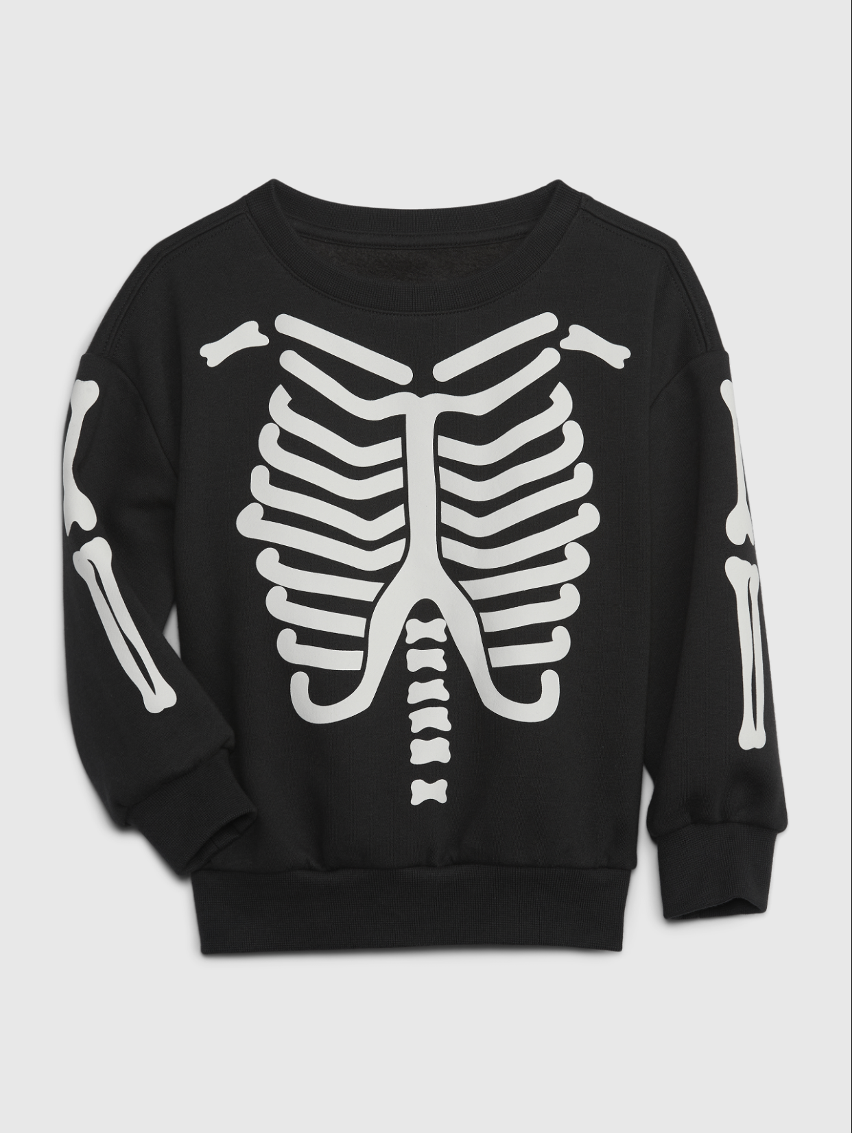 トドラーボーイ(80~110㎝)は、まるでレントゲン写真のようなガイコツの骨がプリントされたスウェットや、ミッキーマウスの体が透けて骨になっているデザインがユニークなロングスリーブTシャツ、着るだけでスーパーマンやバッドマンになりきれるマント付きのTシャツ×パンツのセットアップが登場。トドラーガールズは、骨がホログラムでプリントされた長袖Tシャツや、ギョロッとしたお目目がキュートなスウェットなど、Gapらしい遊び心あるアイテムが揃います。