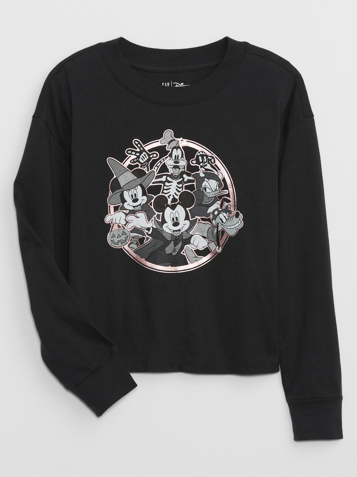 キッズ(110~160㎝)では、ロングスリーブTシャツがラインナップ。ボーイズからは、ナイトメアビフォークリスマスのジャックがジャック・オ・ランタンを持っているデザイン、ガールズは、暗闇で光る蓄光加工の月がプリントされた黒猫のデザイン、ミッキーマウス&ミニーマウスたちがいたずらしようと今にも飛び出しそうなデザインなどラインナップします。ブラックを基調としたアイテムが並びます。