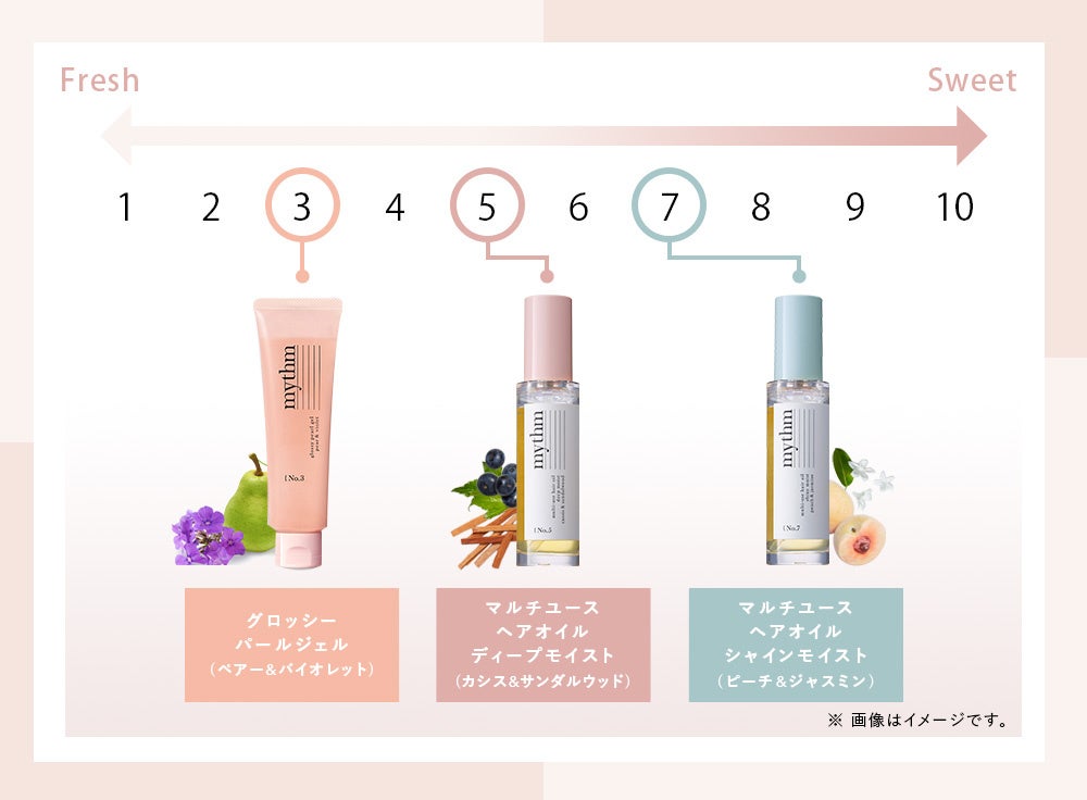 楽天ランキング1位を獲得[*2]するなどご好評いただいたマルチヘアオイルに続いて、今回発売される「mythm グロッシーパールジェル」は、パール成分[*]配合でダメージを受けた髪を補修しながら、艶やかな濡れ髪と程よく抜け感がつくれるスタイリング剤です。