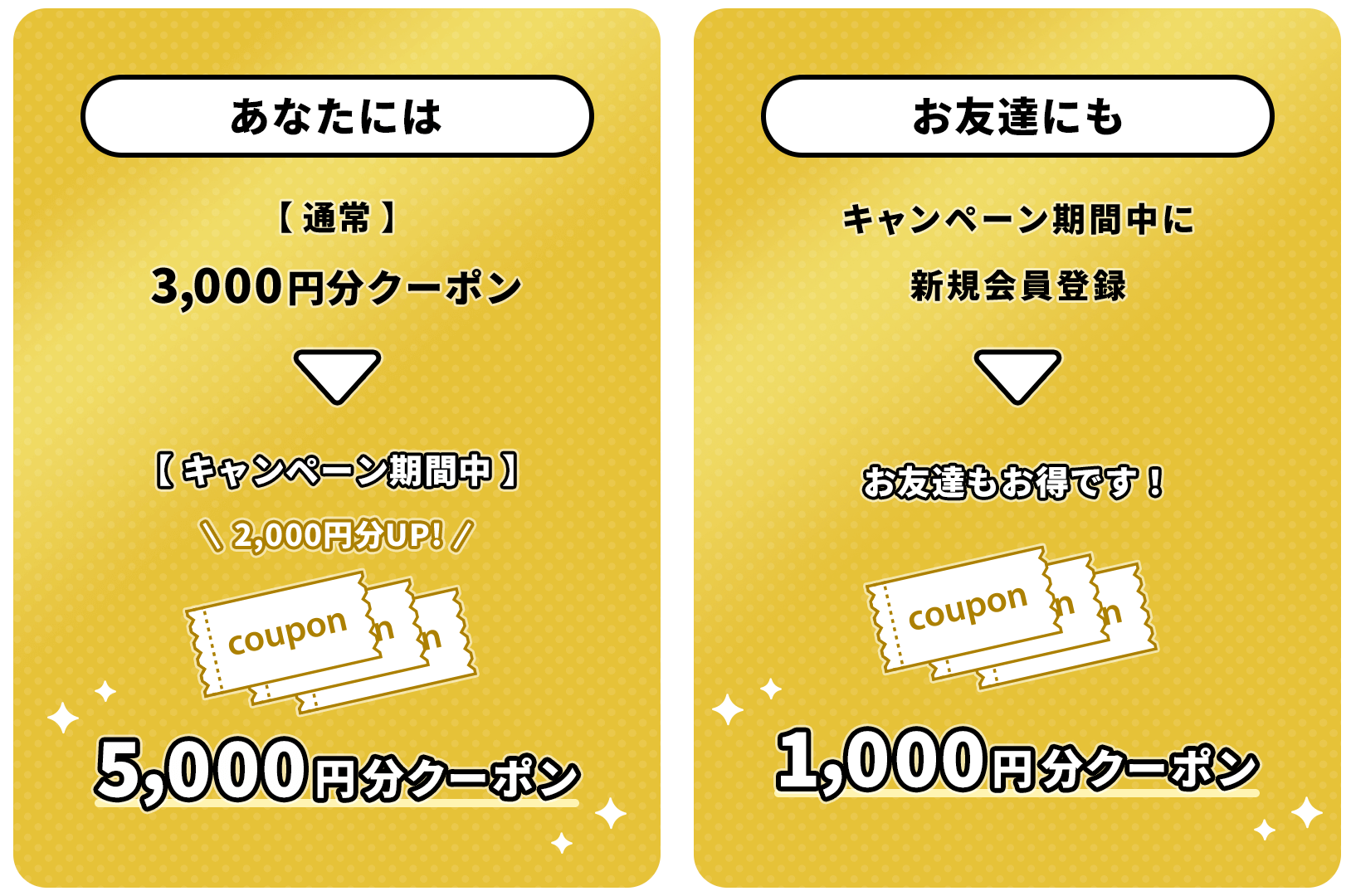 お友達紹介をご利用いただくと、紹介者へ通常3,000円分クーポンのところ、特別に5,000円分クーポンをプレゼントいたします。