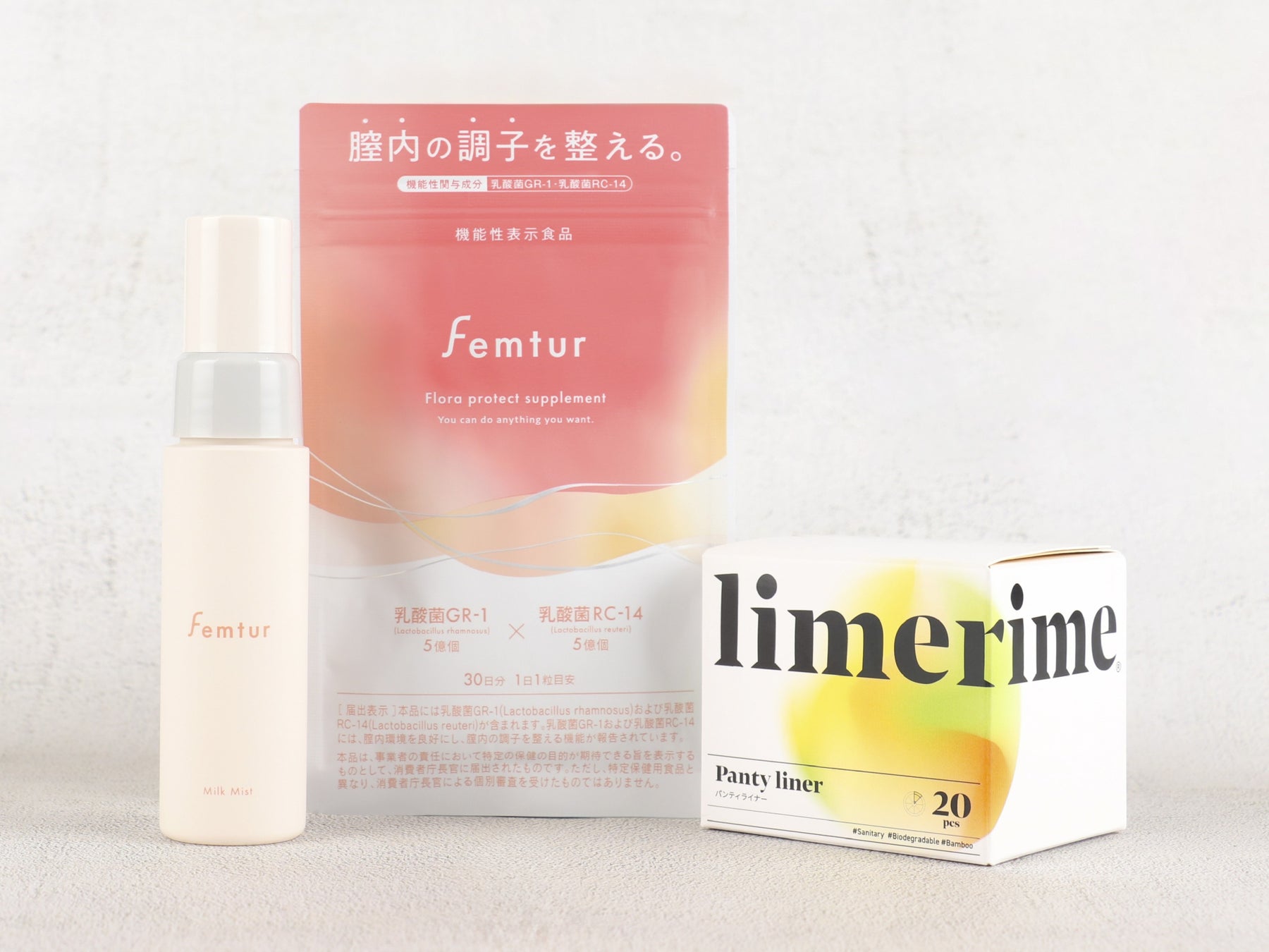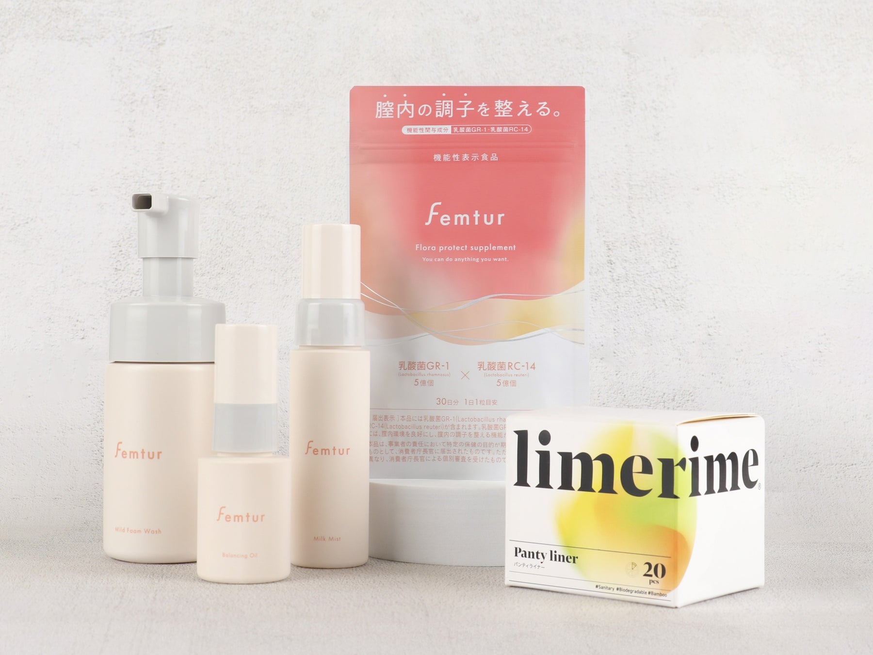 フェミニンフローラに着目した腟エイジングケアブランド「Femtur(フェムチャー)」は、ミドル世代を中心に悩みを抱えるデリケートゾーンの乾燥や痒みなどのお悩みを、我慢せずに楽しく快適に過ごせるよう、正しいケアや情報の発信を行っています。女性ホルモンの変化に向き合い、乳酸菌による膣ケアで、女性の未来につながる美と健康を叶えるブランドとして、現在全4商品を展開。9月19日(木)より開始するブランドキャンペーンでは、コットンやシルクよりも優しい肌触りを実現し、天然の竹の繊維を使用した生理用品を展開するブランド「limerime(ライムライム)」とのコラボレーションが決定。洗浄料とおりものシートをセット使いすることで、総合的にデリケートゾーンのお悩み解決にアプローチすることができます。