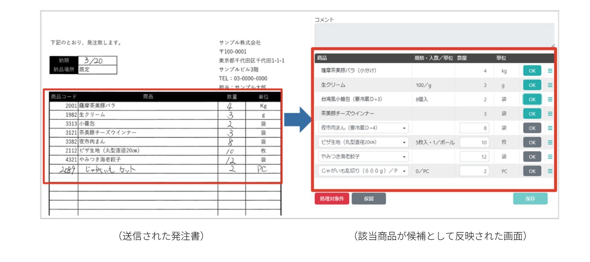 学習前の商品が発注された場合、商品名の類似度から“マスタ候補を紐づけた結果”を学習することで、2回目以降の商品特定が可能になります。