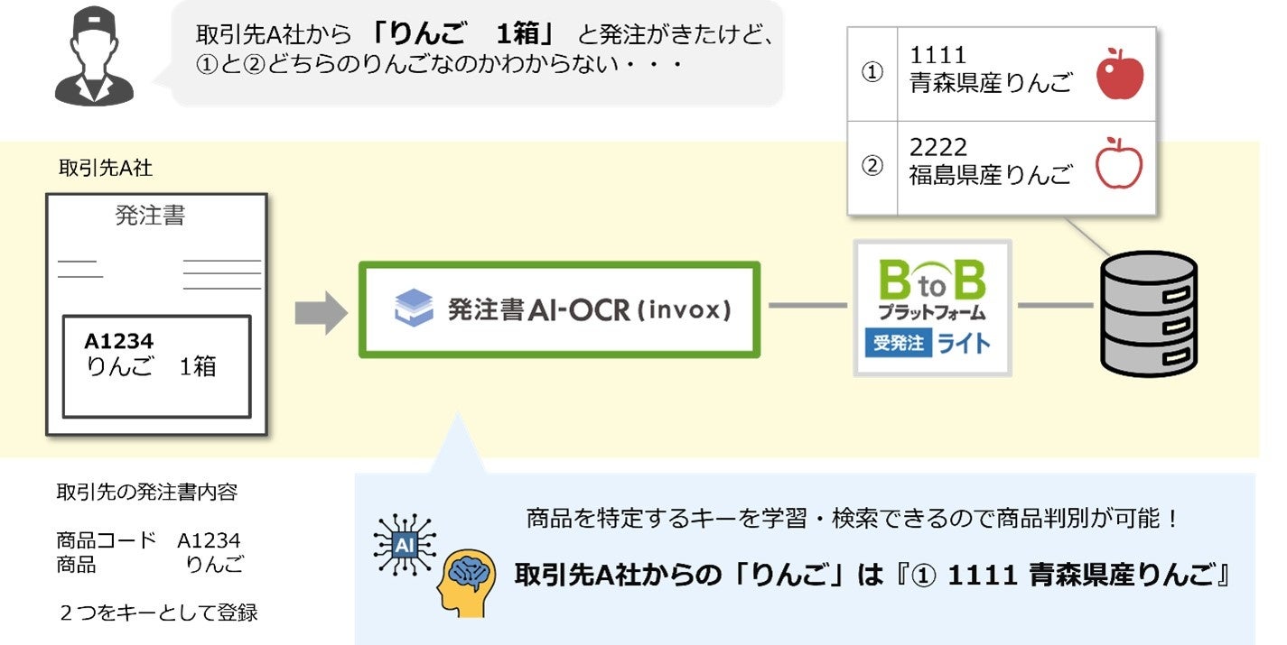 データ化された発注書では、「BtoBプラットフォーム 受発注ライト」に設定されている発注マスタ(得意先別マスタ情報)を参照し、該当商品が候補として反映されます。「発注書AI-OCR(invox)」には商品特定に特化したAIが搭載されており、取引先の商品名・商品コードに紐づけた「BtoBプラットフォーム 受発注ライト」のマスタを学習していく仕組みです。