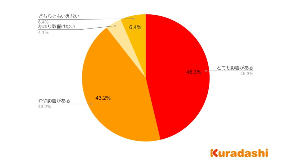 「とても影響がある」と回答した方が46.3%、「やや影響がある」と回答した方が43.2%で、回答者全体の89.5%が家計への影響を感じているという結果でした。