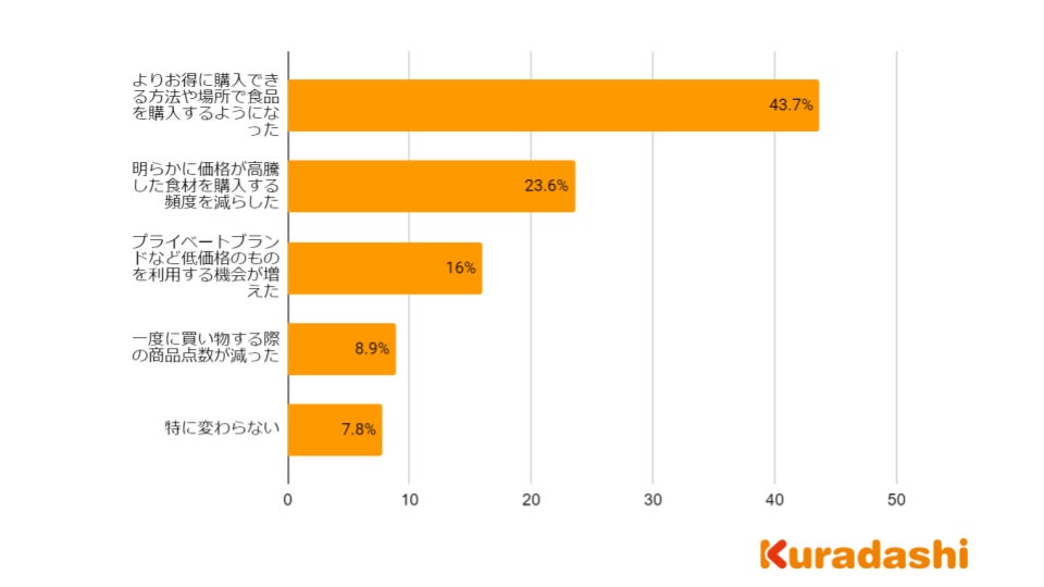 「よりお得に購入できる方法や場所で食品を購入するようになった」と回答した方が43.7%、「明らかに価格が高騰した食材を購入する頻度を減らした」と回答した方は23.6%となりました。お買い物する場所、頻度を工夫している方が多いことが読み取れます。