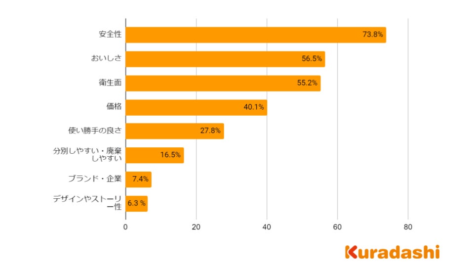 「安全性」が最も多く73.8%となりました。次いで「おいしさ」が56.5%、「衛生面」が55.2%となり、サステナブルの商品を選ぶ基準として、おいしさよりも安全性や衛生面を気にされる方が多いことが読み取れます。