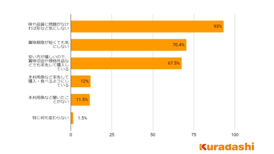 「味や品質に問題なければ形など気にしない」方が93%と最も多く、次いで「賞味期限が短くても気にしない」と回答した方が70.4%となりました。賞味期限内でかつ品質などに問題がないのであれば、お得な商品を購入したいと多くの方が考えていることが読み取れます。