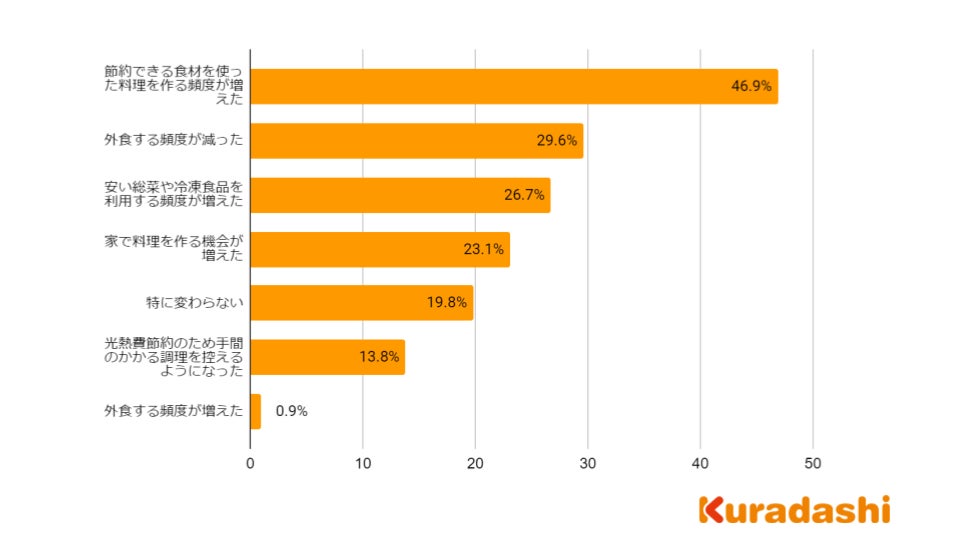 食生活の変化として「節約できる食材を使った料理を作る頻度が増えた」と回答した方が最も多く46.9%でした。次いで「外食する頻度が減った」が29.6%、「安い惣菜や冷凍食品を利用する頻度が増えた」が26.7%でした。節約を意識して料理をされる方が増えているのがわかります。