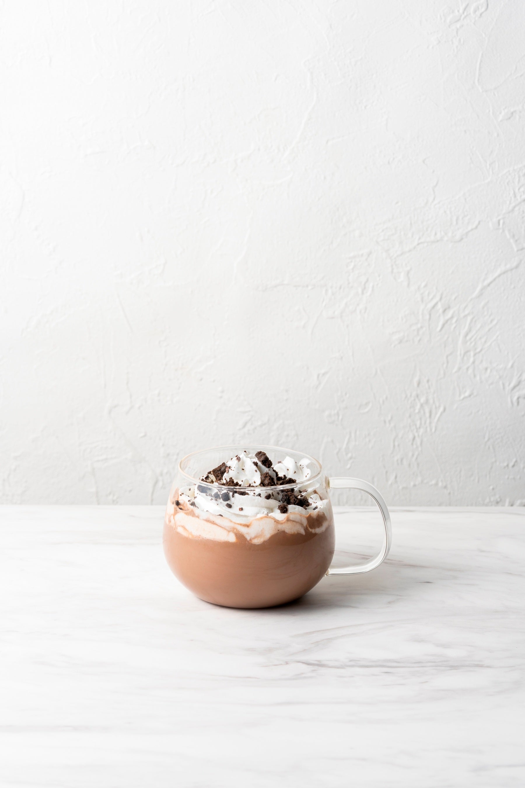 ゴディバカフェで人気のチョコレートドリンク「Gショコラリッチ」に、たっぷりのホイップクリームをのせ、砕いたココアビスケットとカカオニブをトッピングしました。