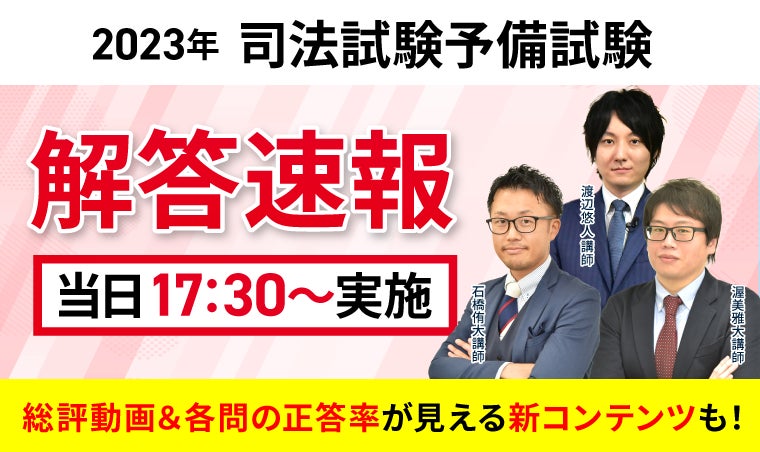 アガルートアカデミーは、令和5年(2023年)司法試験予備試験(短答式試験)当日に「解答速報」「試験総評動画」を会員登録不要で無料公開いたします。ぜひ、試験の振り返りにお役立てくださいませ。