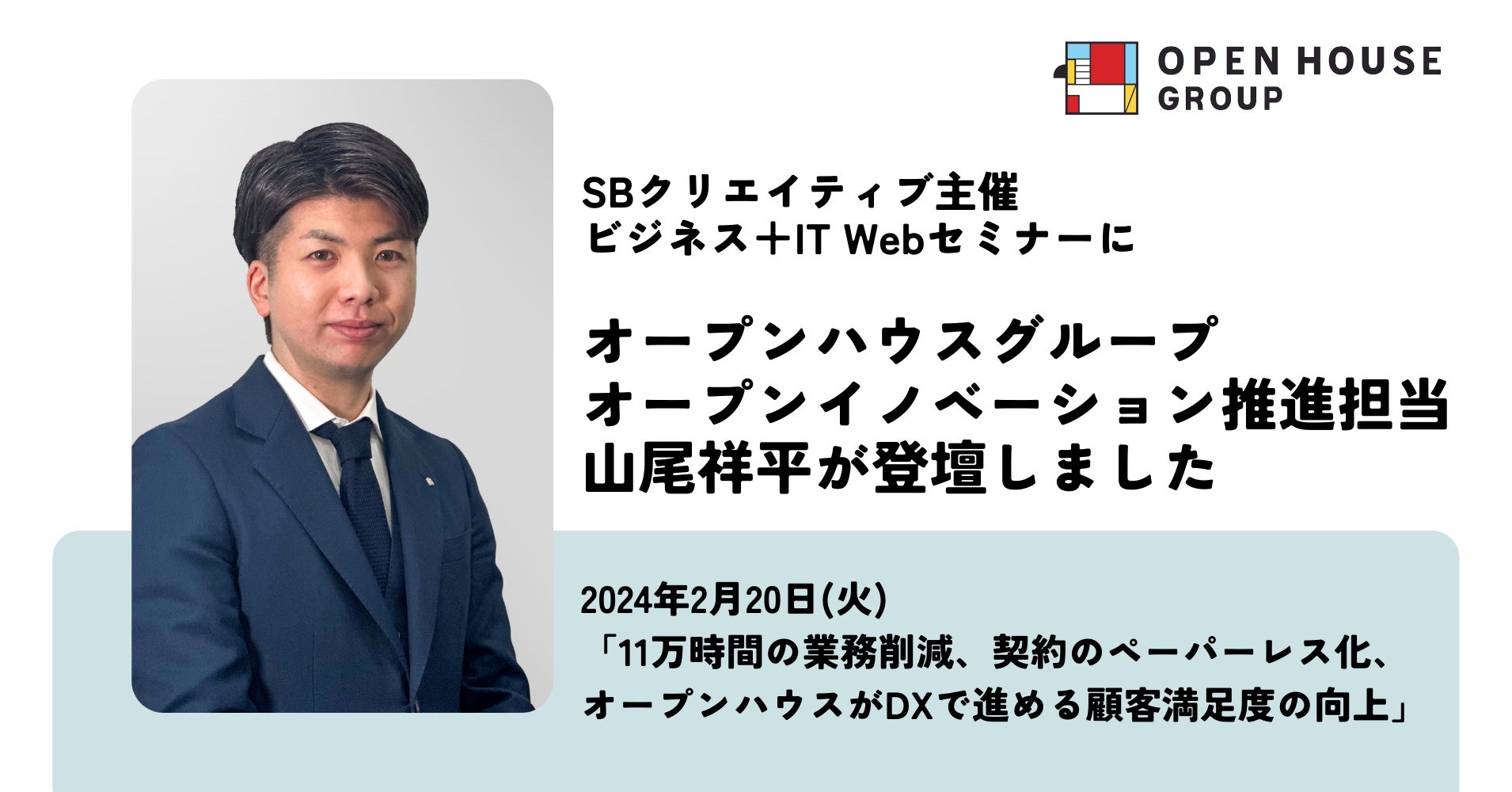 株式会社オープンハウスグループ(本社 東京都千代田区、代表取締役社長 荒井正昭、以下「当社」)より、当社ブランドコミュニケーション部オープンイノベーション推進担当 山尾祥平が、2024年2月20日(火)に開催された「ビジネス+IT Webセミナー ワークフロー/経費精算 2024」(主催:SBクリエイティブ株式会社、以下「本セミナー」)にて登壇し、当社グループのデジタルトランスフォーメーション(DX)についての考え方と取り組みについてお話させていただきました。