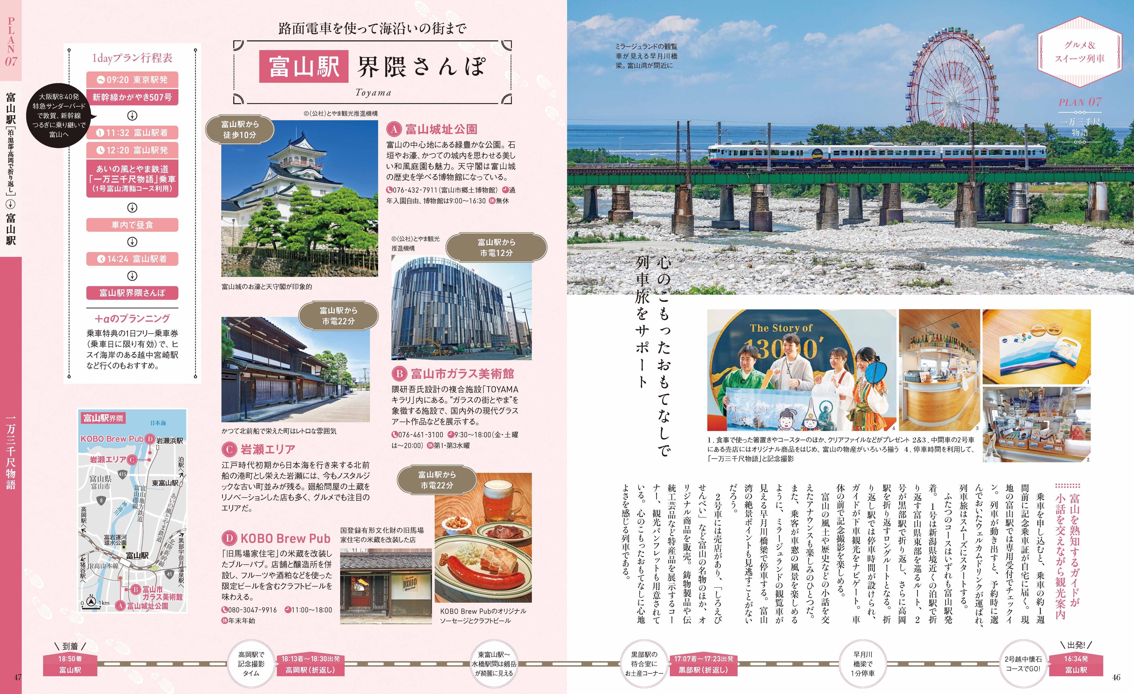 途中駅や終着駅での過ごし方を提案する「1dayモデルプラン」を掲載。地元の名物料理や観光スポット、おしゃれカフェなど、鉄道旅の楽しみが広がる充実の内容です。駅界隈の地図付きなのもうれしいポイントです。